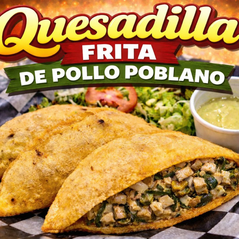 Quesadilla frita hecha en maiz, rellena de pollo poblano , acompañada de verdura y salsita de la casa.