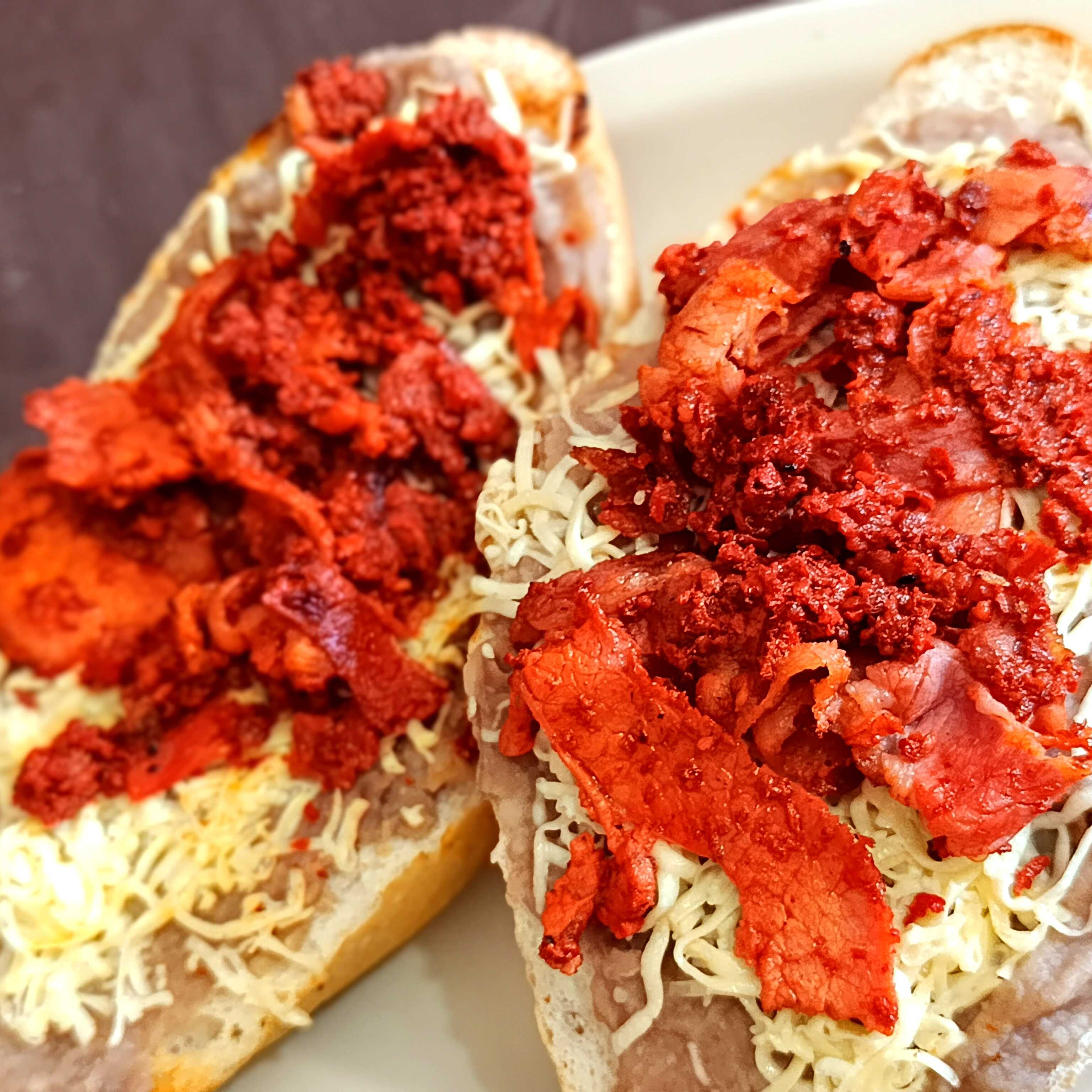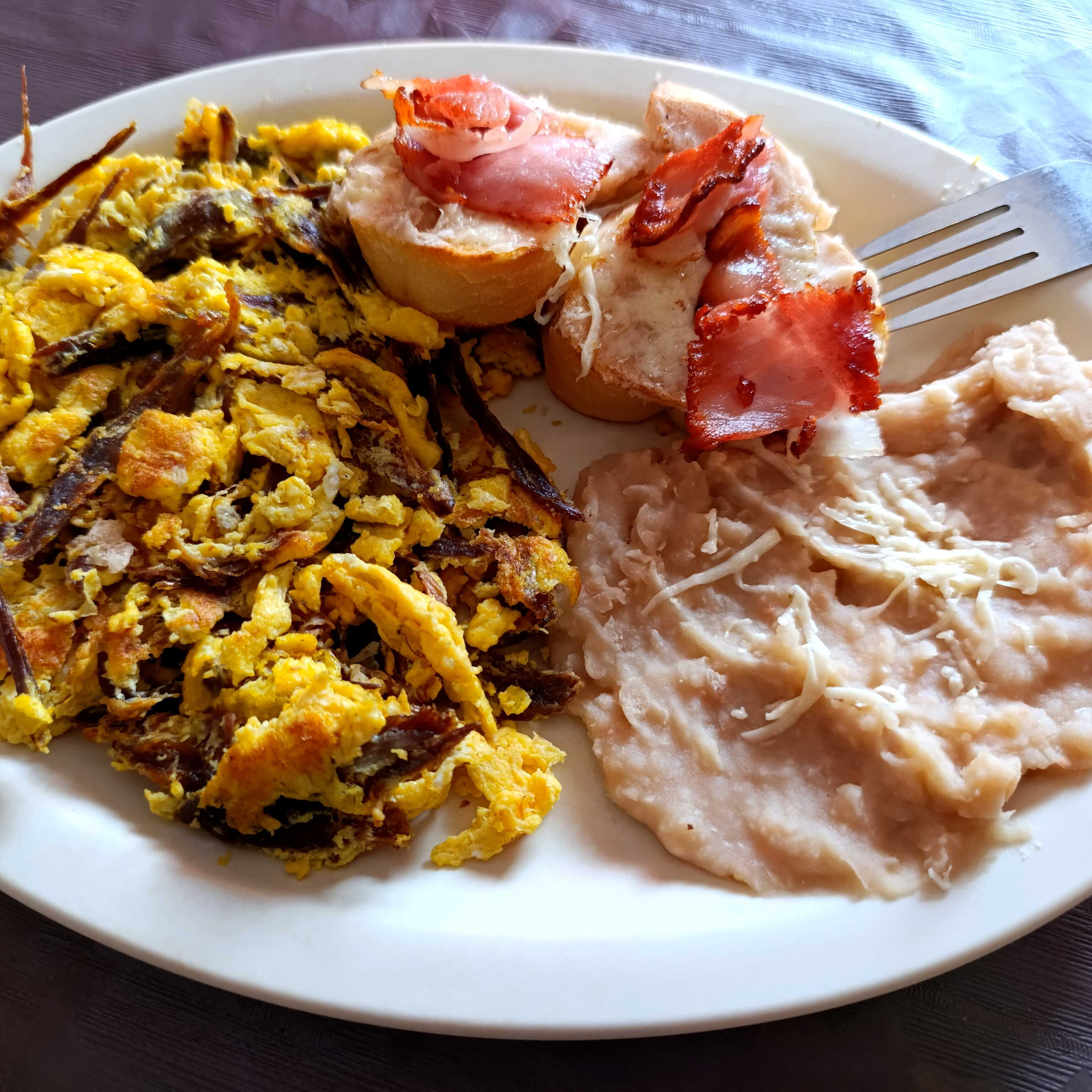 2 mitades pan francés con frijoles, queso manchego acompañado con tocino, chorizo o jamón