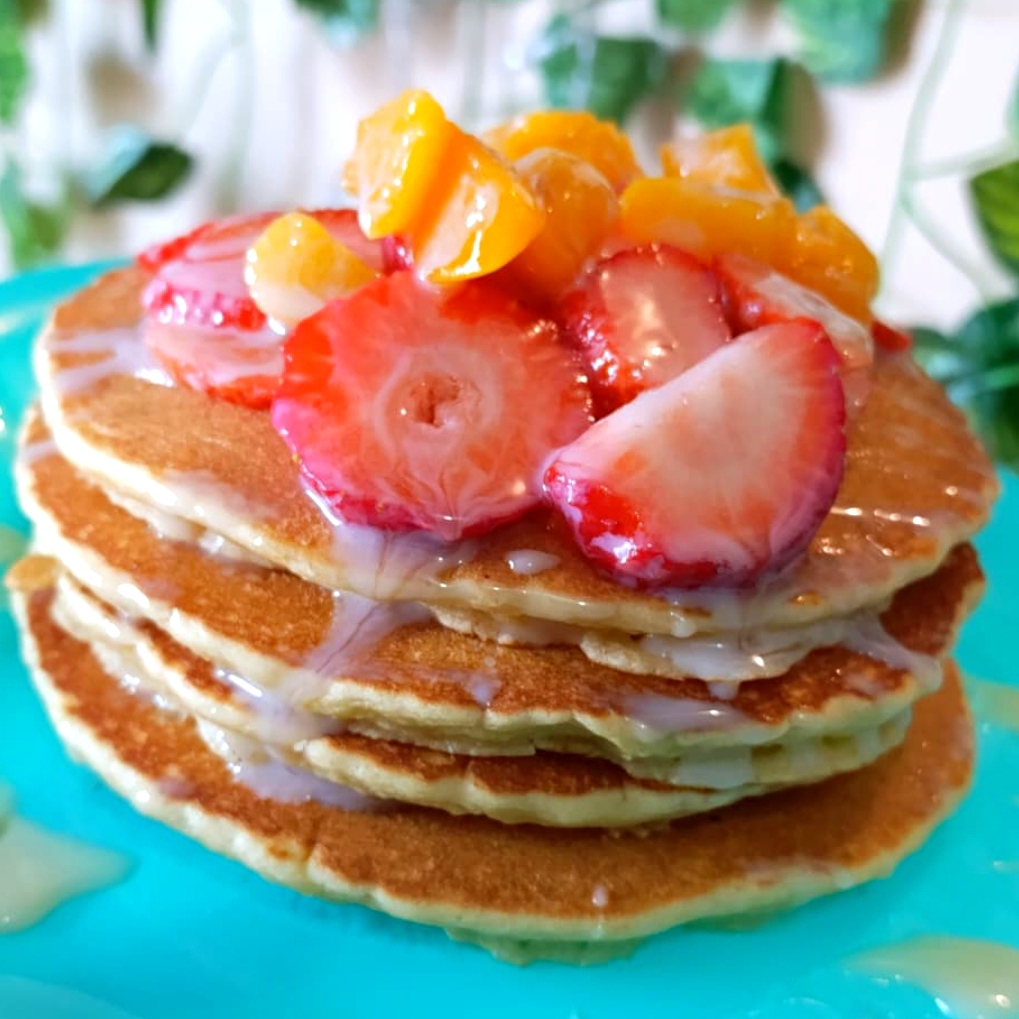 4 hotcakes, fruta, miel maple, lechera, dulce de leche o chocolate.
