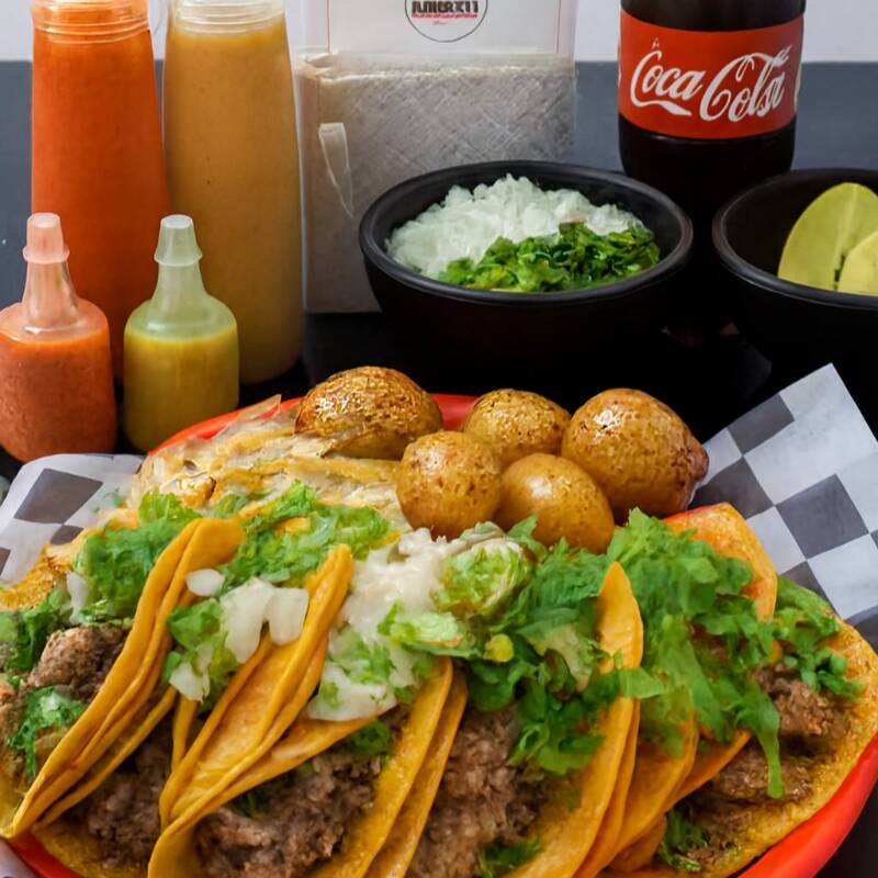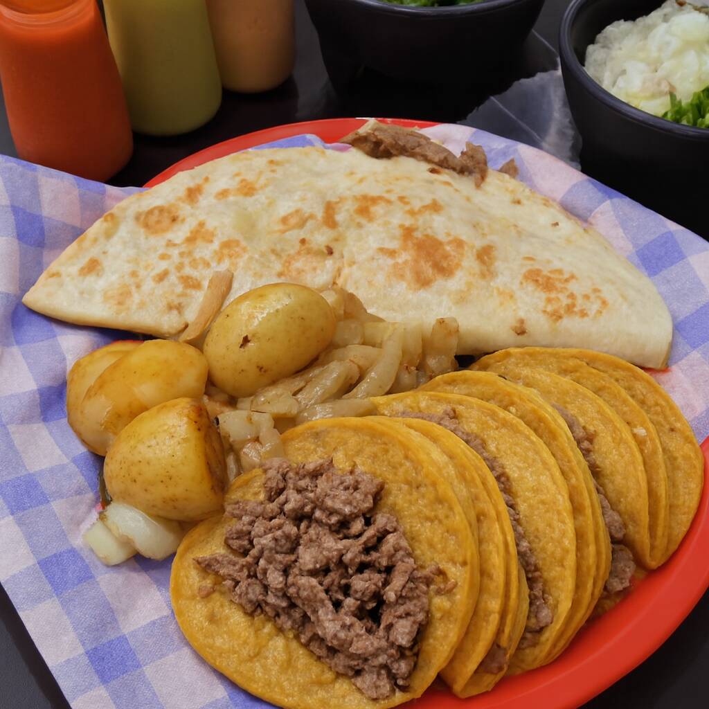 Tortilla de maíz rellena de bistec (5 pzas) acompañadas de cebollita caramelizada y papa de galeana. Incluye cilantro, cebolla y salsa.