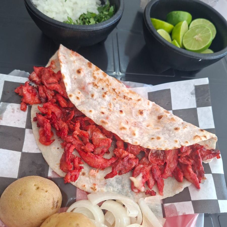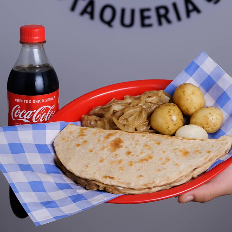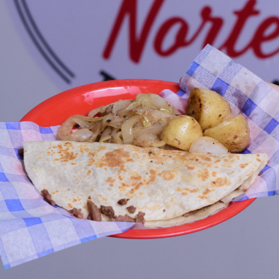 Tortilla de harina (medida de 25 cm) rellena de bistec con queso, acompañada de cebollita caramelizada, papa de galeana. Incluye cilantro, cebolla y salsa.
