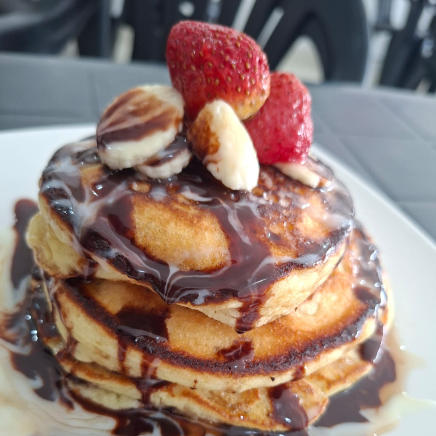 3 piezas de mini Hot cakes (10cm c/u) bañados en miel Lechera y chocolate líquido, decorados con fresas y plátano