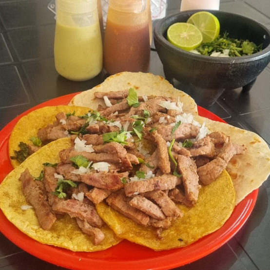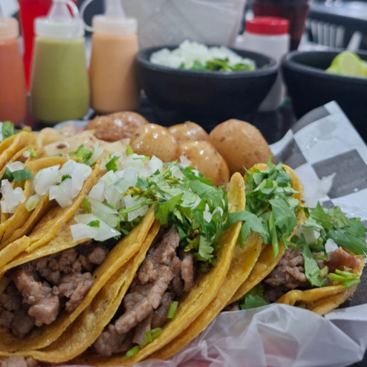 Tortilla de maíz rellena de bistec (3 pzas) acompañadas de cebollita caramelizada y papa de galeana. Incluye cilantro, cebolla y salsa.