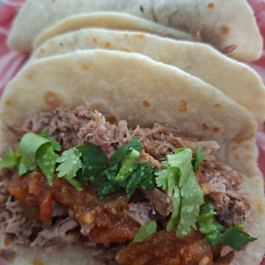 Tacos (harina o maíz)de deliciosa barbacoa de res, cocinada en penca de maguey a fuego lento