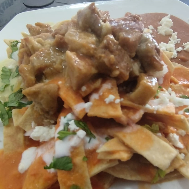 (Media orden) Chilaquiles bañados en salsa sobre una cama de frijoles, incluye queso gratinado, cilantro, cebolla, crema y un guiso de tu elección