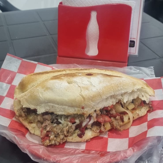 Pan lagunero relleno de bistec, queso y cebolla caramelizada