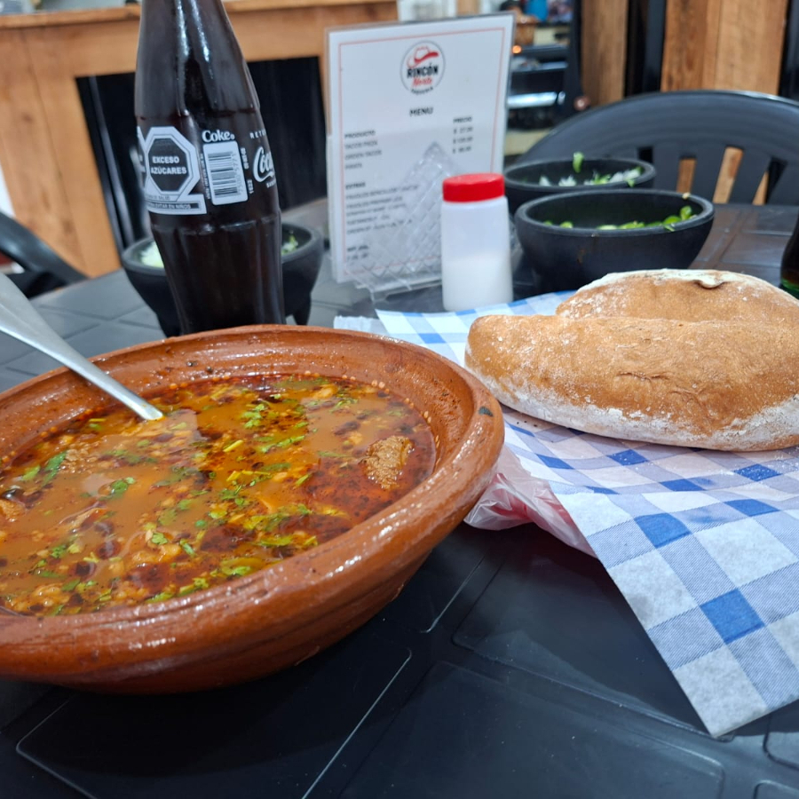 Caldo tradicional con panza de res, preparado con diferentes tipos de chiles rojo y especias. incluye por separado cebolla, orégano, limón y chile .
