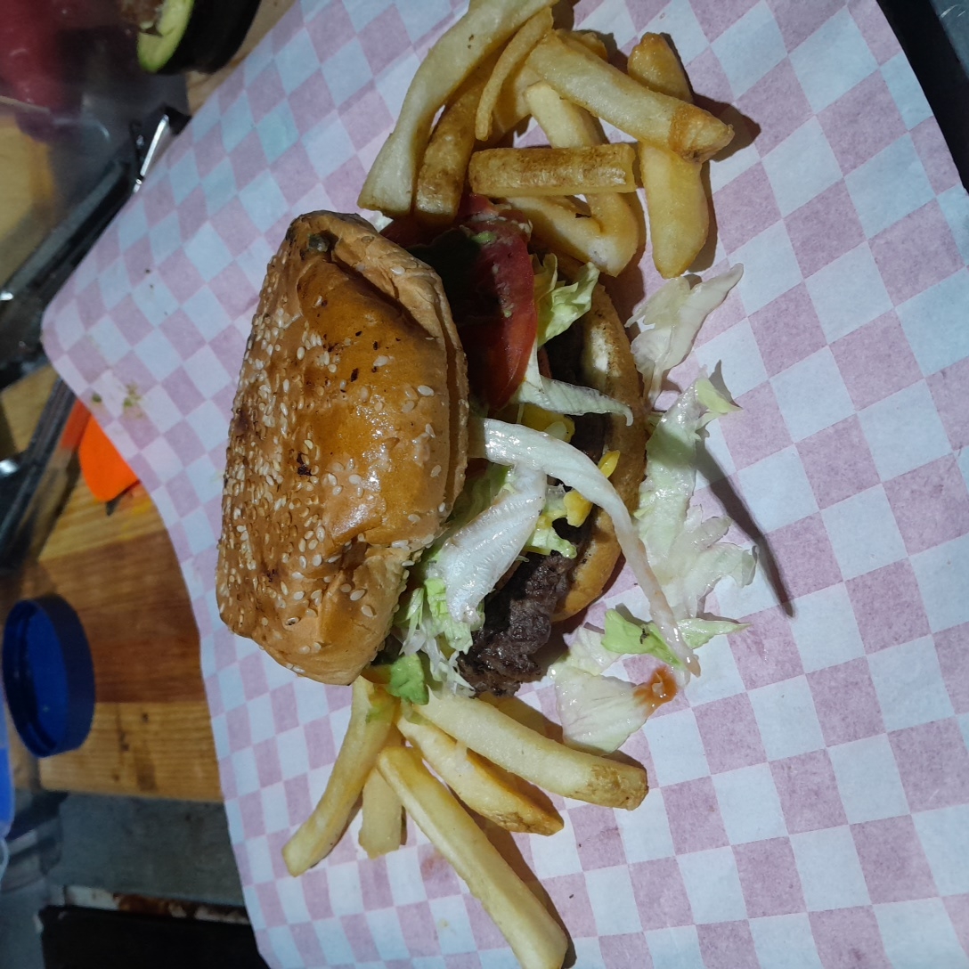 Pan para hamburguesa, carne de res,queso amarillo, mayonesa,capsu,mostaza,lechuga ,tomate ,y chiles en vinagre