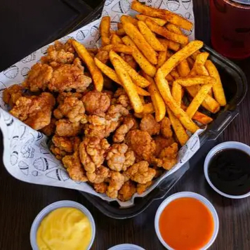 Papas con lemon pepper, queso amarillo y 150 g de bonneles con salsa a tu gusto.