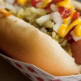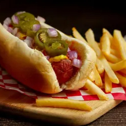 Salchicha con cebolla a la plancha, tomate y aderezos ➕ Incluye papas a la francesa.