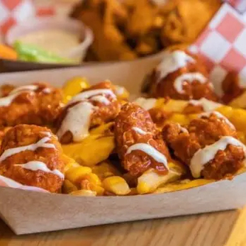 Papas con salsa Buffalo, queso,chiles y tocino a la plancha.