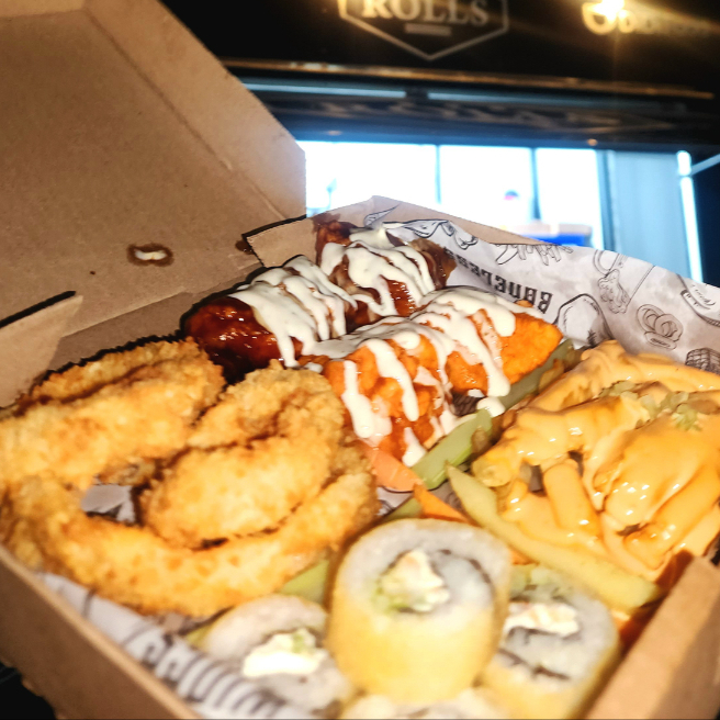 8 Pzs de boneless en salsa bbq y buffalo, 8 aros de cebolla empanizados, papas fritas bañadas en crema de sriracha, y sushi empanizado relleno de queso crema, aguacate y camarón