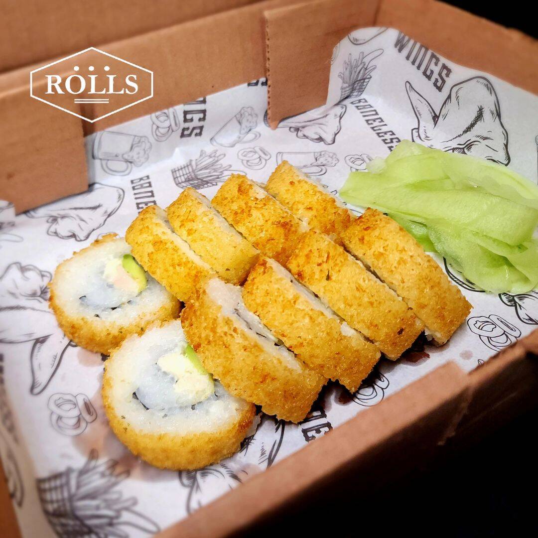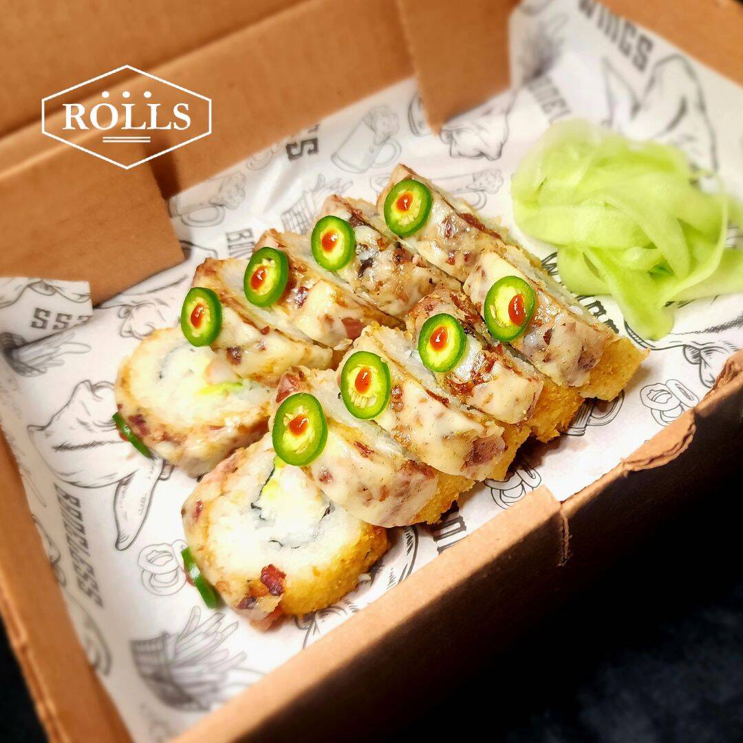 Rollo empanizado con relleno de camarón, aguacate y queso crema, capeado con queso gratinado y trozos de tocino, rodajas de chile serrano y sriracha, acompañado con papas fritas