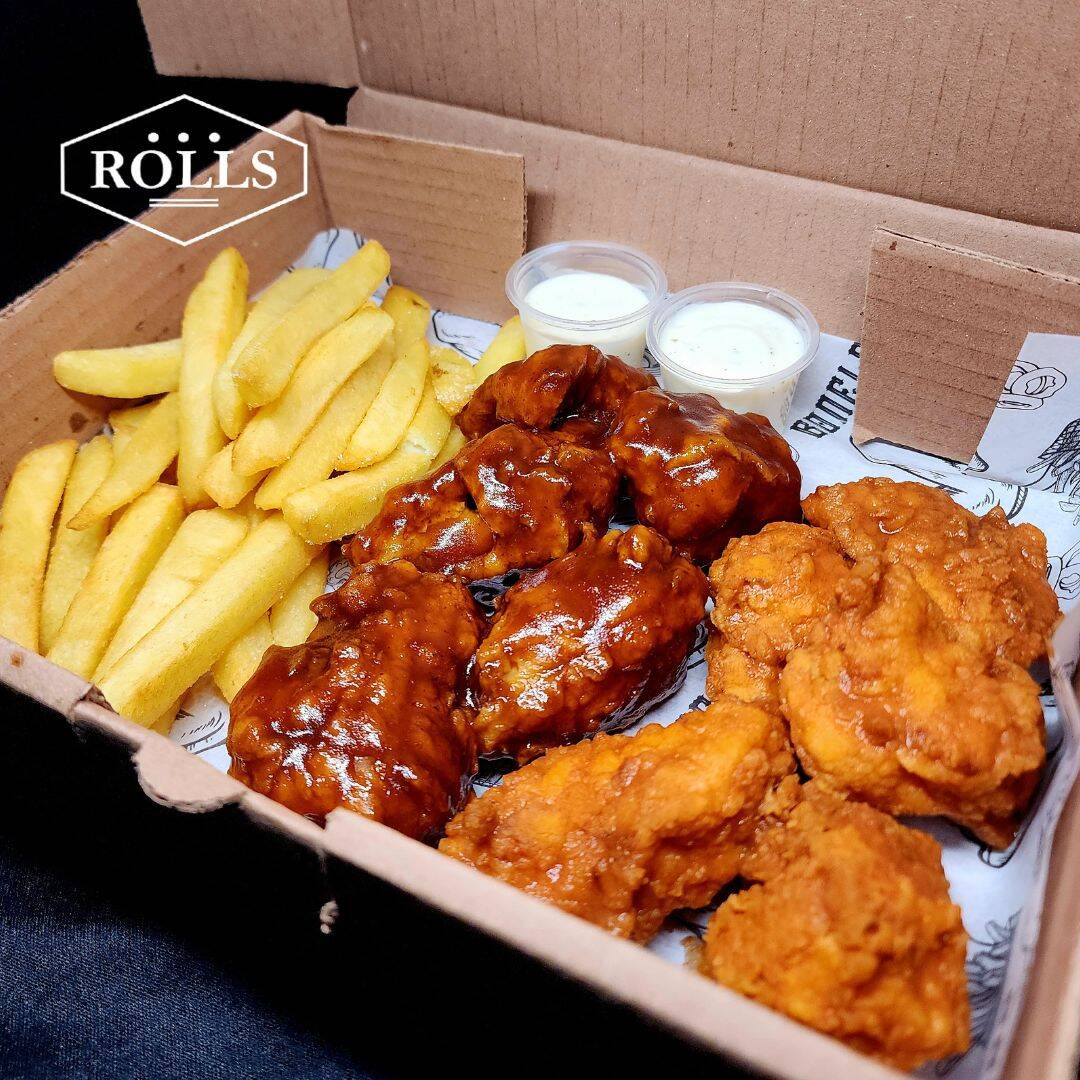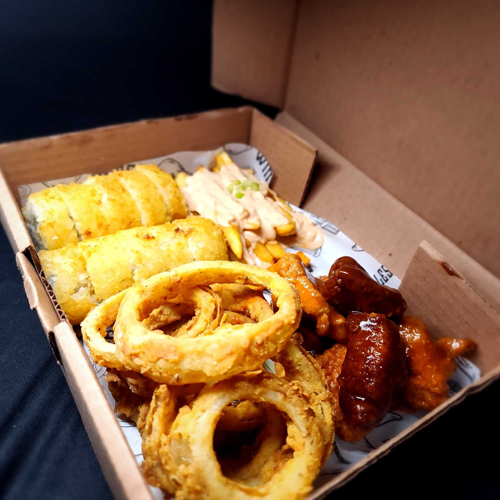 4Pzs de boneless en salsas bbq y buffalo, 4 aros de cebolla empanizados, papas fritas bañadas en crema de sriracha, medio rollo de sushi empanizado relleno de queso crema, aguacate y camarón