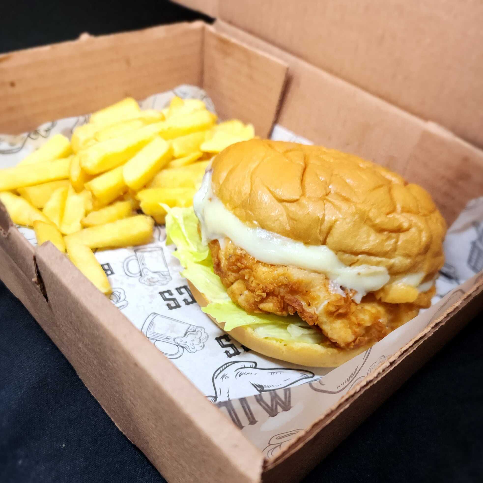 Hamburguesa de pollo empanizado con lechuga, tomate, queso gratinado, mayonesa, acompañada con papas fritas