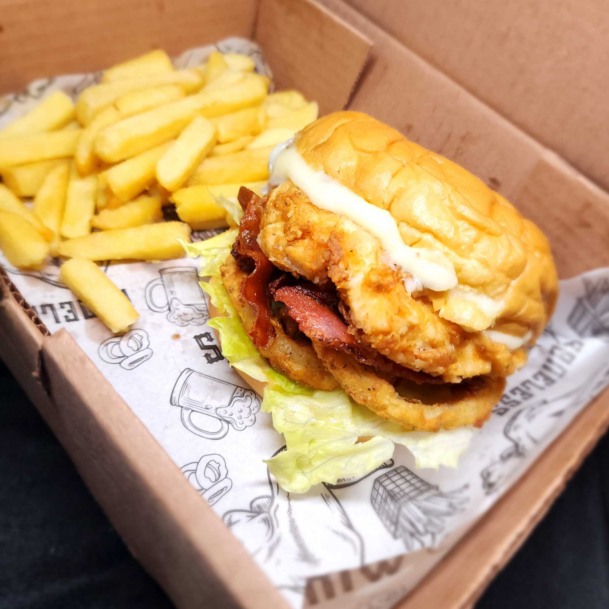 Hamburguesa de pollo empanizado, tocino, aros de cebolla empanizados, lechuga. tomate, queso gratinado y mayonesa, acompañada con papas fritas