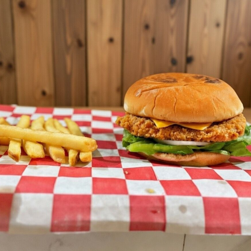 Hamburguesa de pollo frito en la salsa de tu eleccion,cebolla,tomate,lechuga,queso,aderezo rancho y papas a la francesa