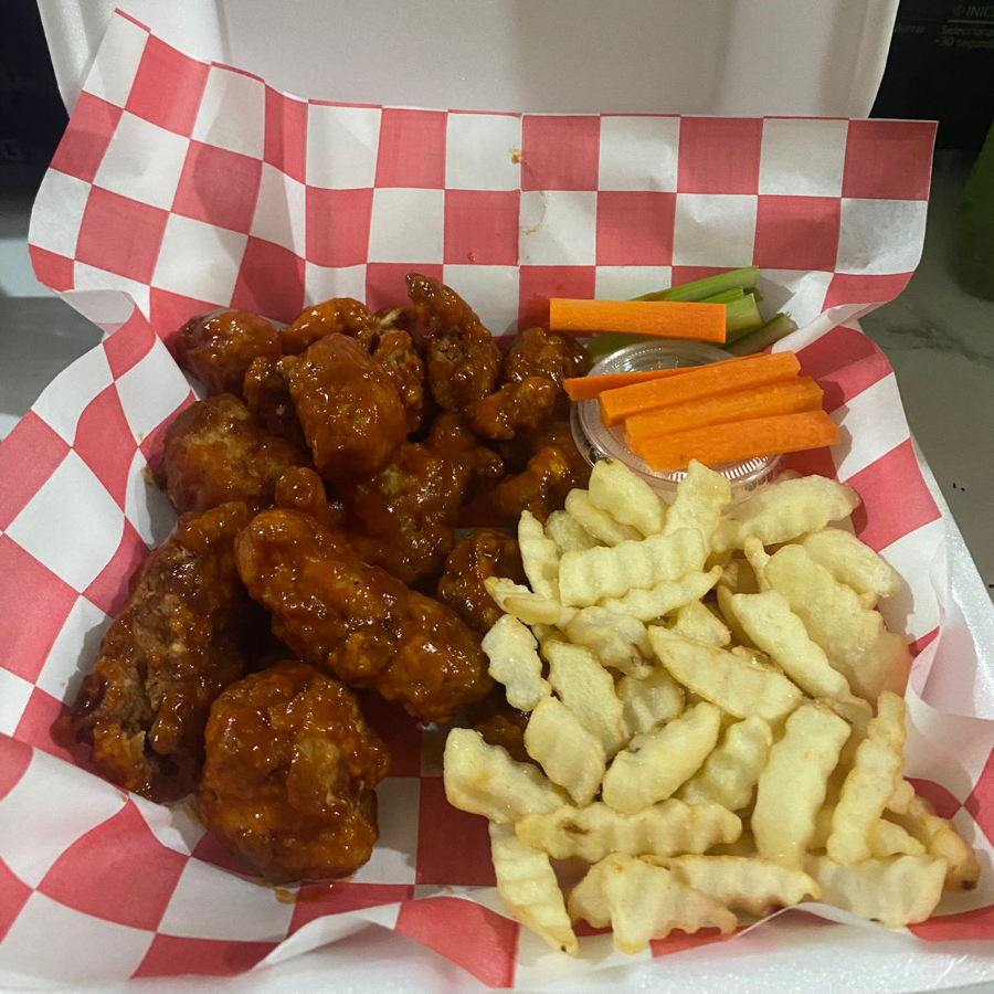 800g de Boneless,Papas con queso,dedos de queso y aros de cebolla,acompañado de aderezos