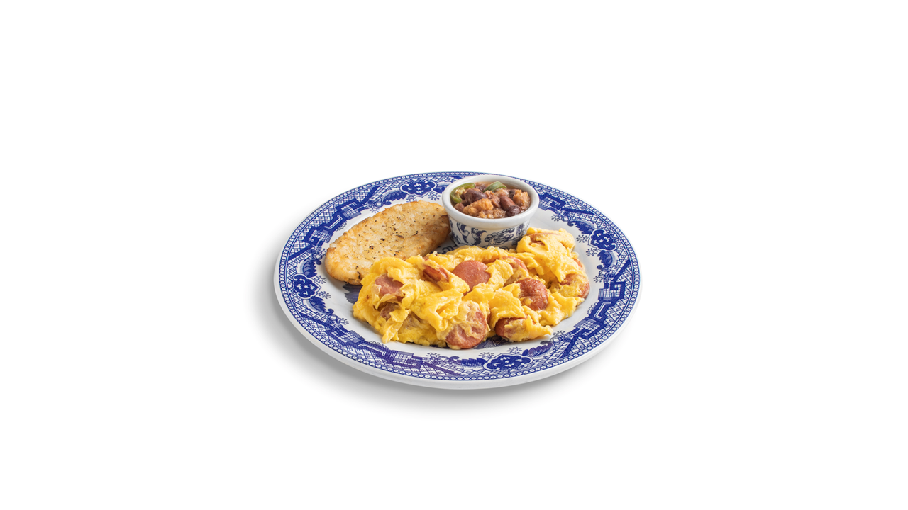 Huevos Revueltos con Salchicha (2 pzas) Servidos con papa hash Brown y frijoles charros.