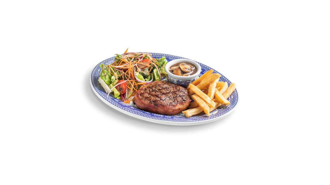 Con salsa de champiñones, papas a la Francesa y ensalada de la casa