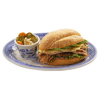 Torta de Carne al Pastor 120 g. (1 pza.). Con queso gouda, cebolla y piña.