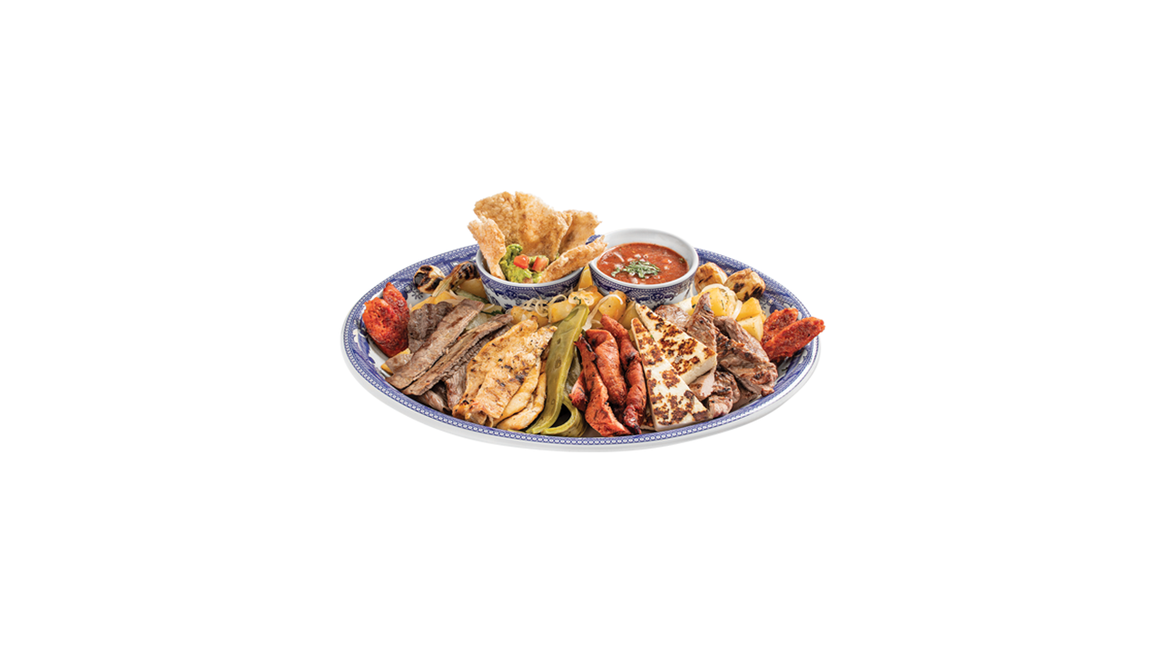 Arrachera, pechuga de pollo, chorizo, cecina de res y cecina de cerdo enchilada, queso panela, cebolla cambray, nopales y guacamole, 1,390 Kg preparado para 3 o 4 personas aprox.