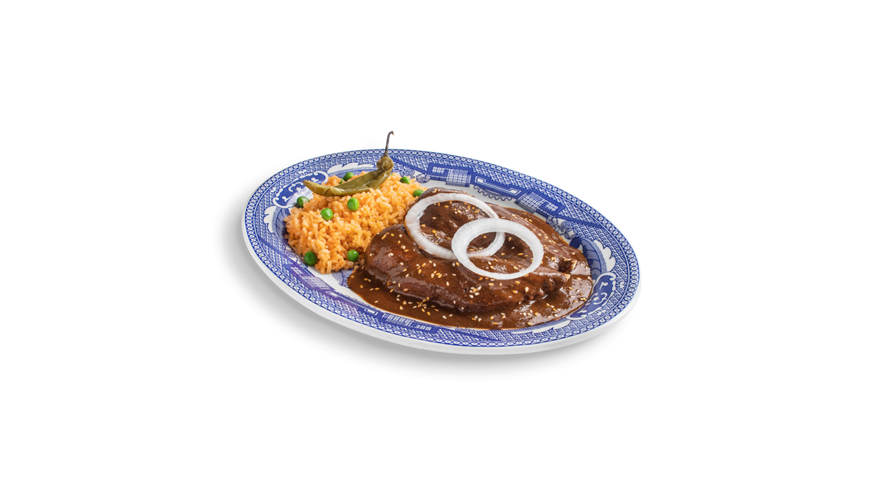 Pechuga de pollo con mole Poblano (180 g). Con arroz a la mexicana.