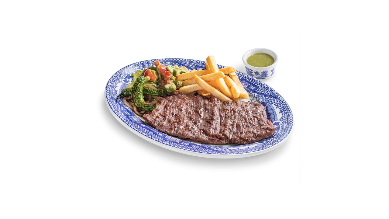"Arrachera (200 g) con papas a la Francesa y guacamole, acompañada de salsa verde"