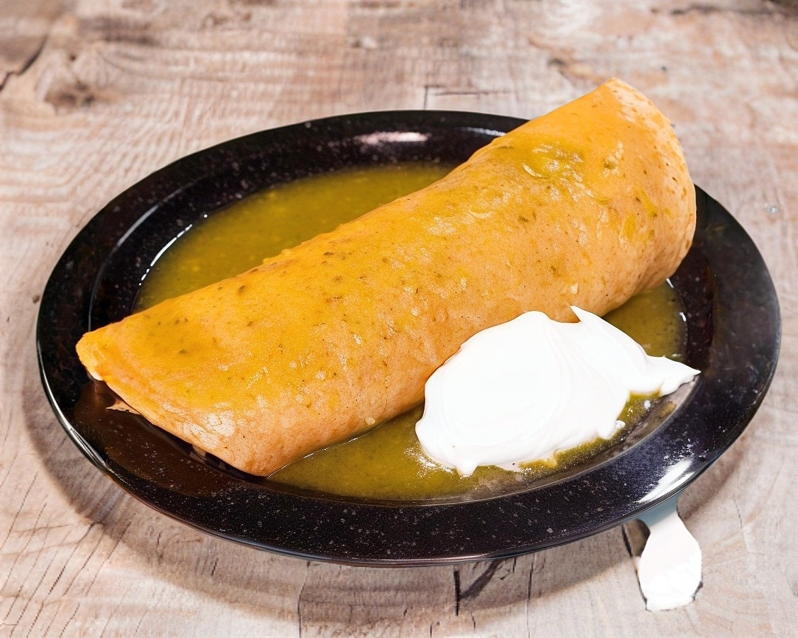 taco en tortilla de maíz con pollo, bañado en salsa tomatillo, crema, queso