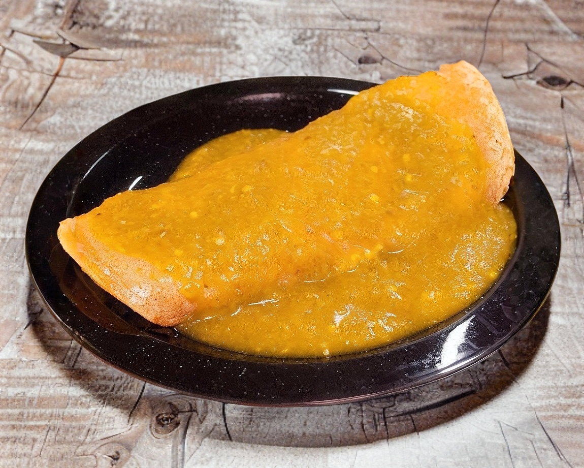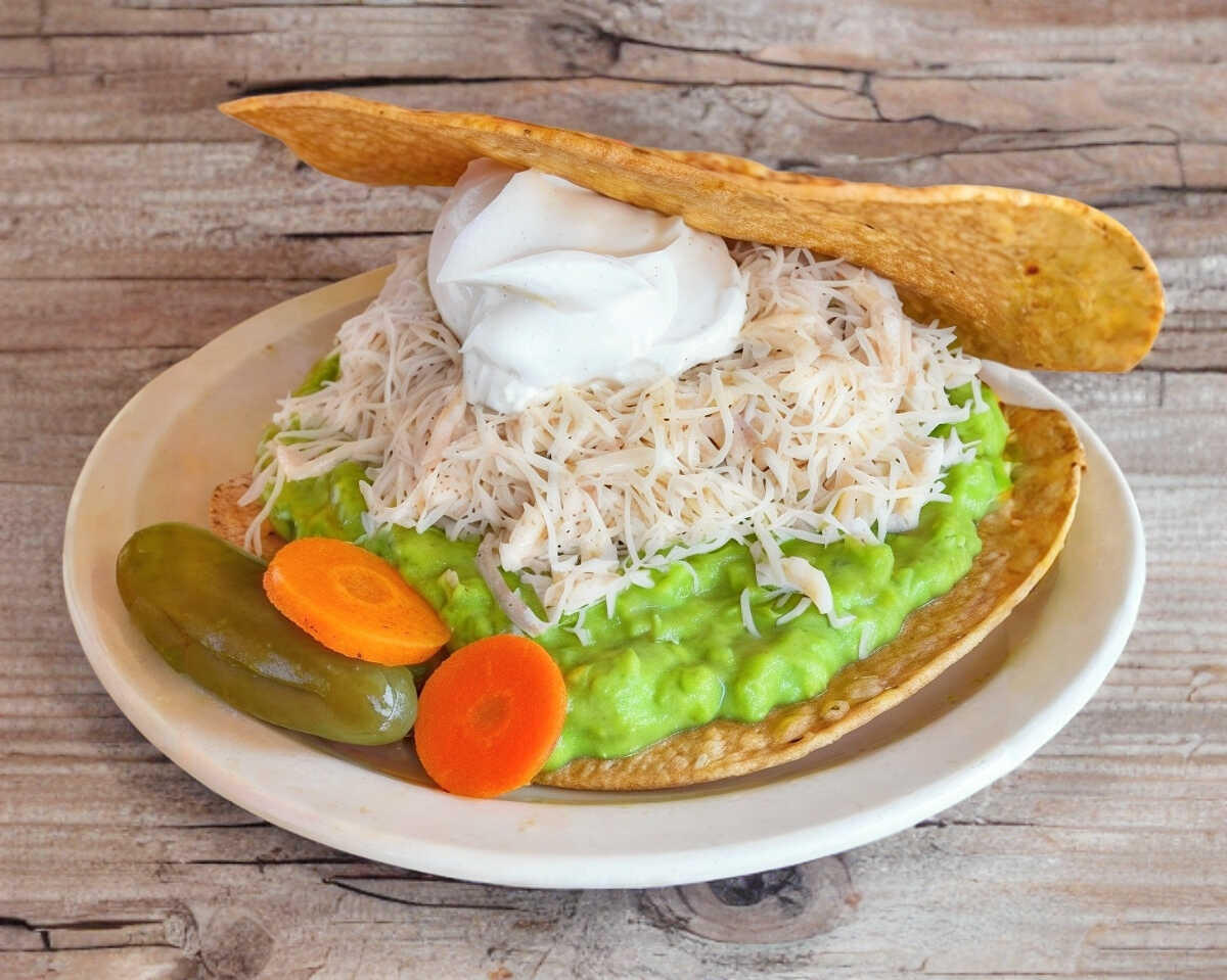 Taco de tortilla de maiz con pehuga de pollo , guacamole , crema , bañado en mole