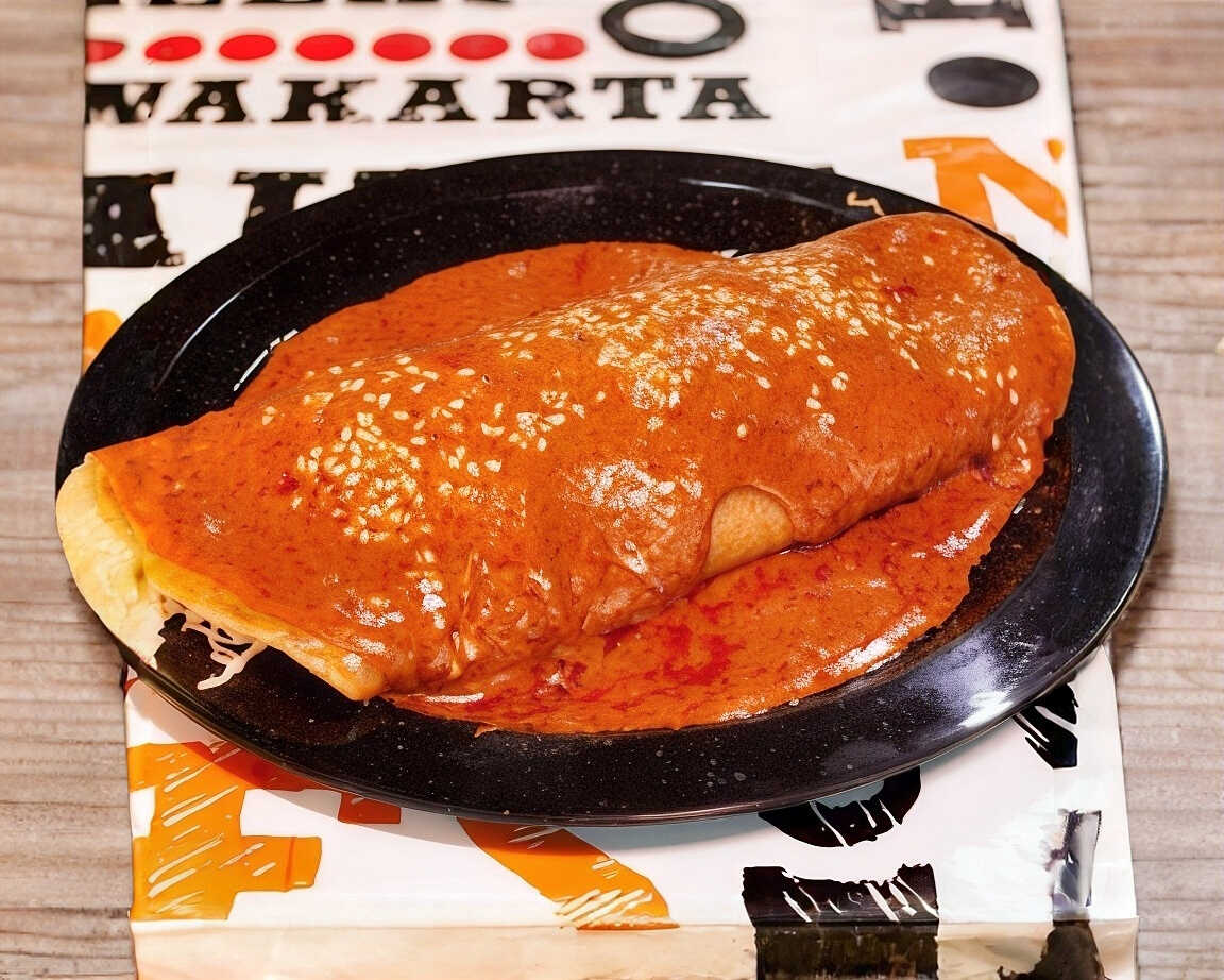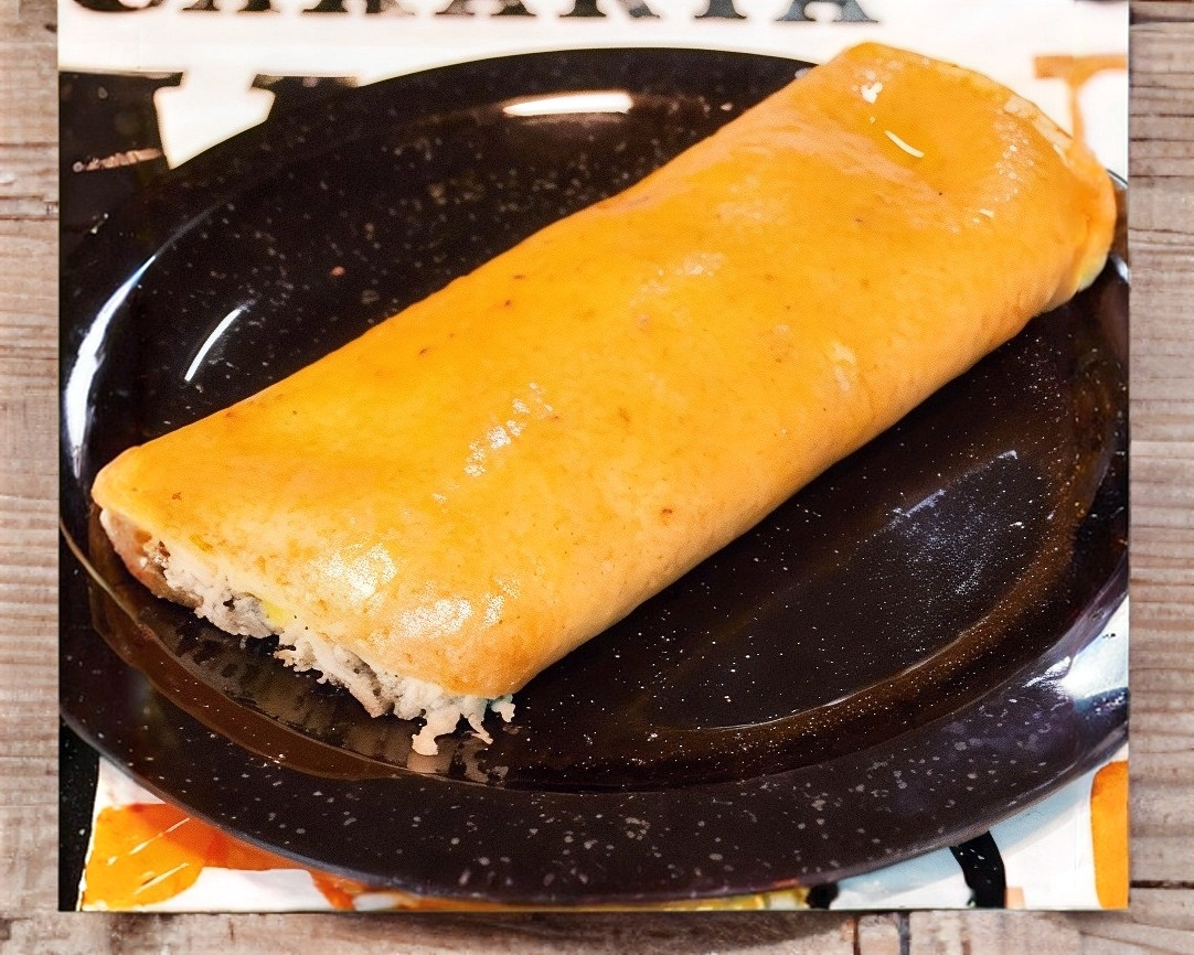 Taco en tortilla de maiz con pollo , aguacate , crema , bañado en salsa de la casa