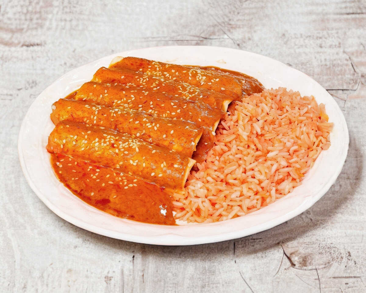 5 tortillas de maiz rellenas de pechuga de pollo , bañadas en mole acompañadas de arroz