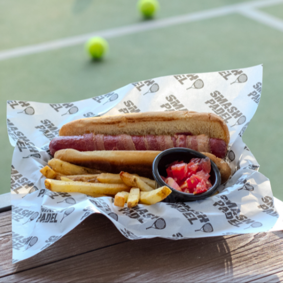 Salchicha de res envuelta en tocino, pan, cebolla, tomate, jalapeño y papas a la francesa.