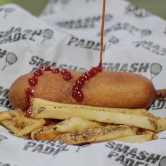 Salchicha cubierta con una mezcla crunchy honey acompañada de papas a la francesa.