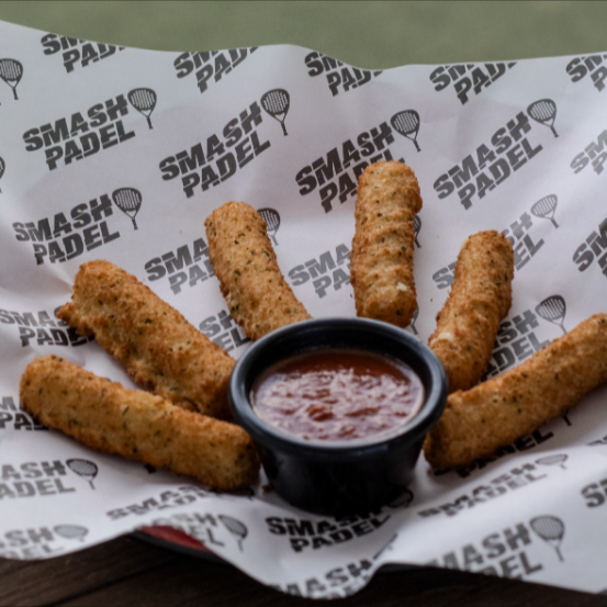 8 Piezas de dedos de queso acompañados con salsa de tomate.