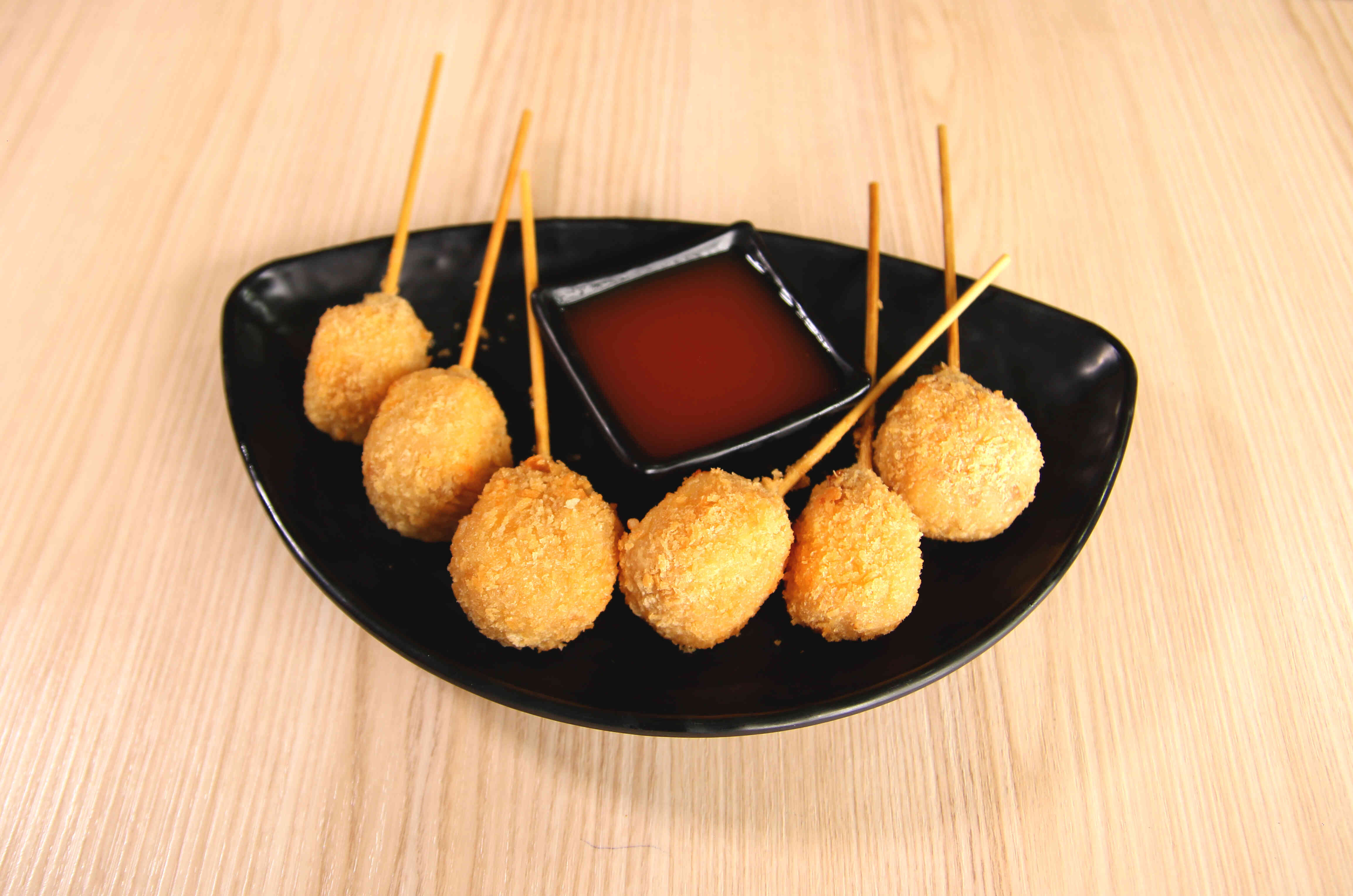 4 brochetas de queso manchego empanizadas y salsa kushiage