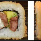 Camaron capeado,aguacate,queso crema,jalapeño y por fuera salmon con ajonjoli negro