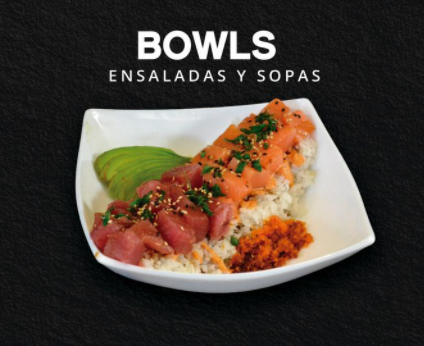 Salmon,atun,masago,aguacate,aderezo chipotle, cebollines y arroz al vapor acompañado con nuestra salsa de la casa