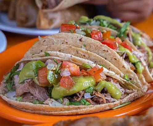 4 Tacos en tortilla de harina, cebolla morada con habanero, pico de gallo, salsa verde o roja.