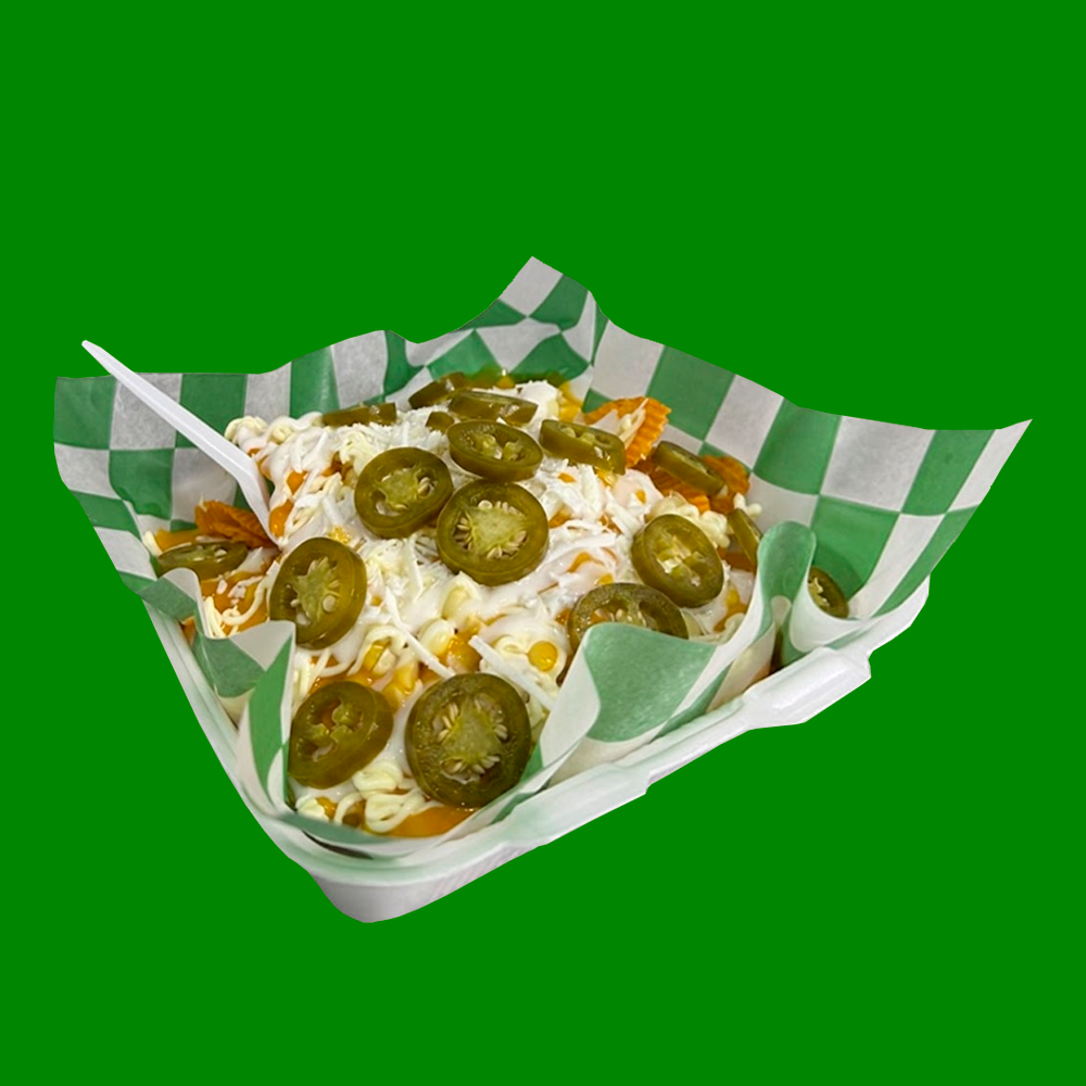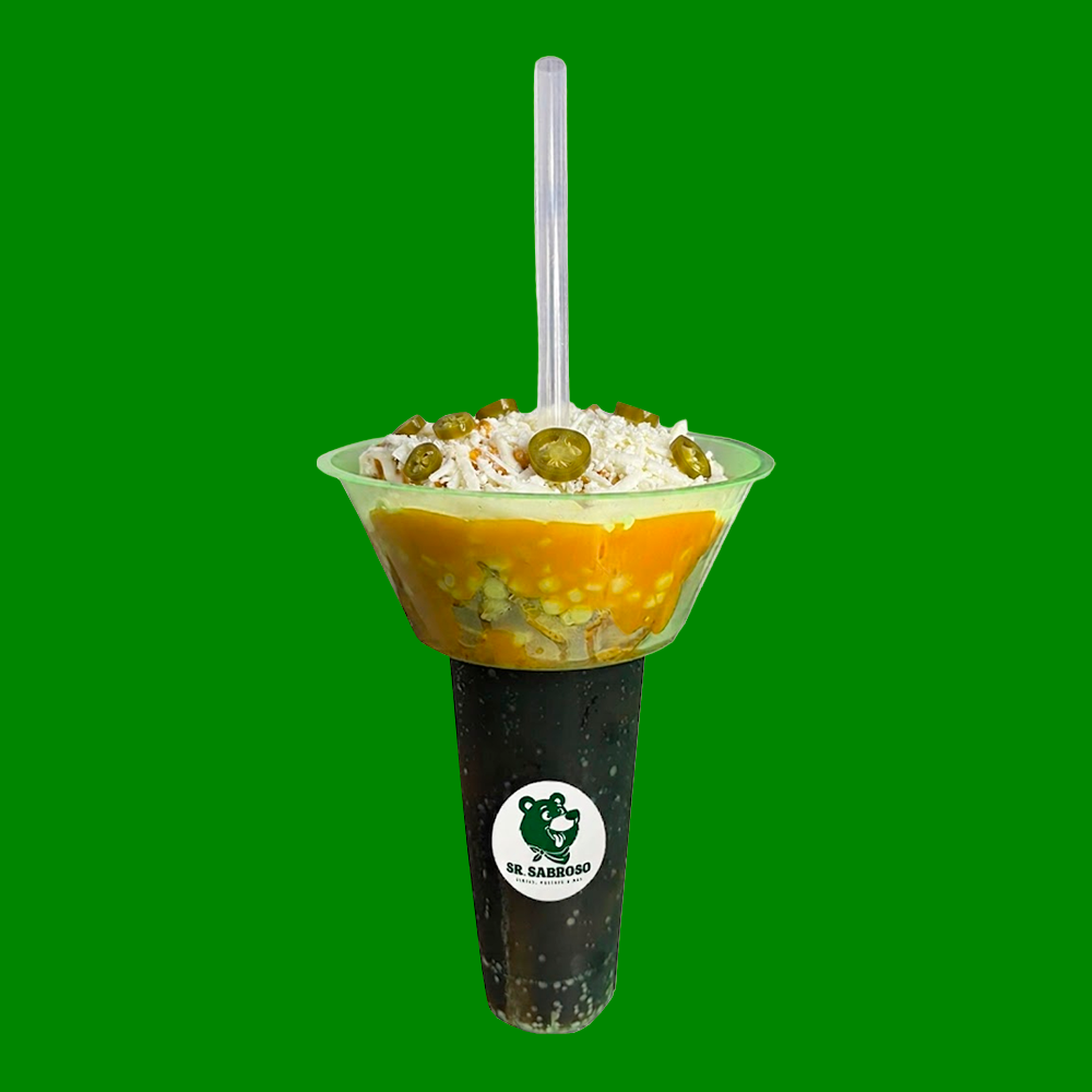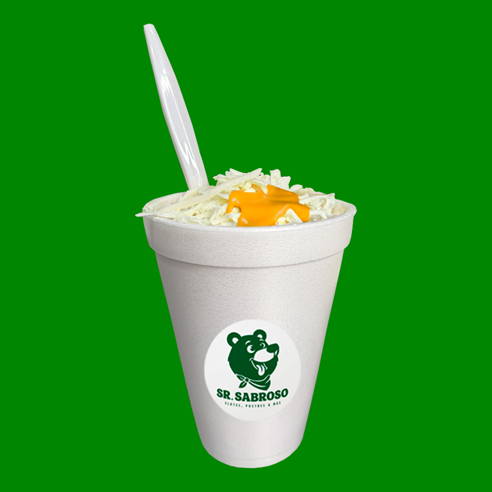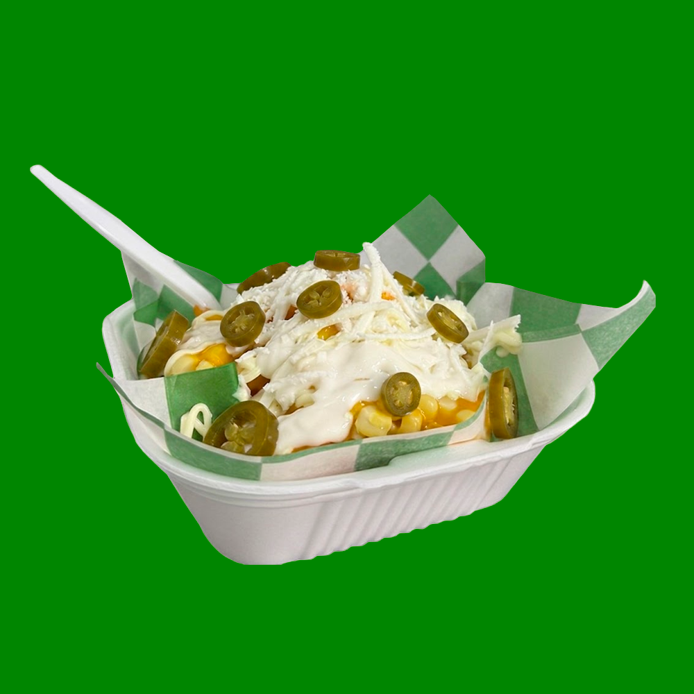 Bolsa de papitas preparada con elote, queso amarillo, queso blanco rayado, crema, mayonesa y jalapeños.