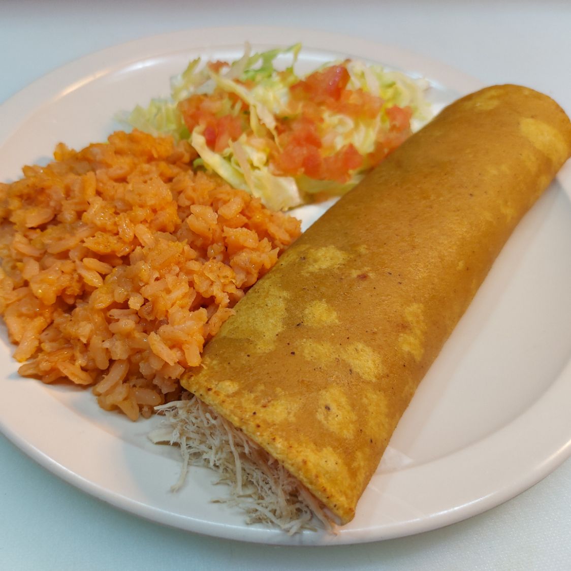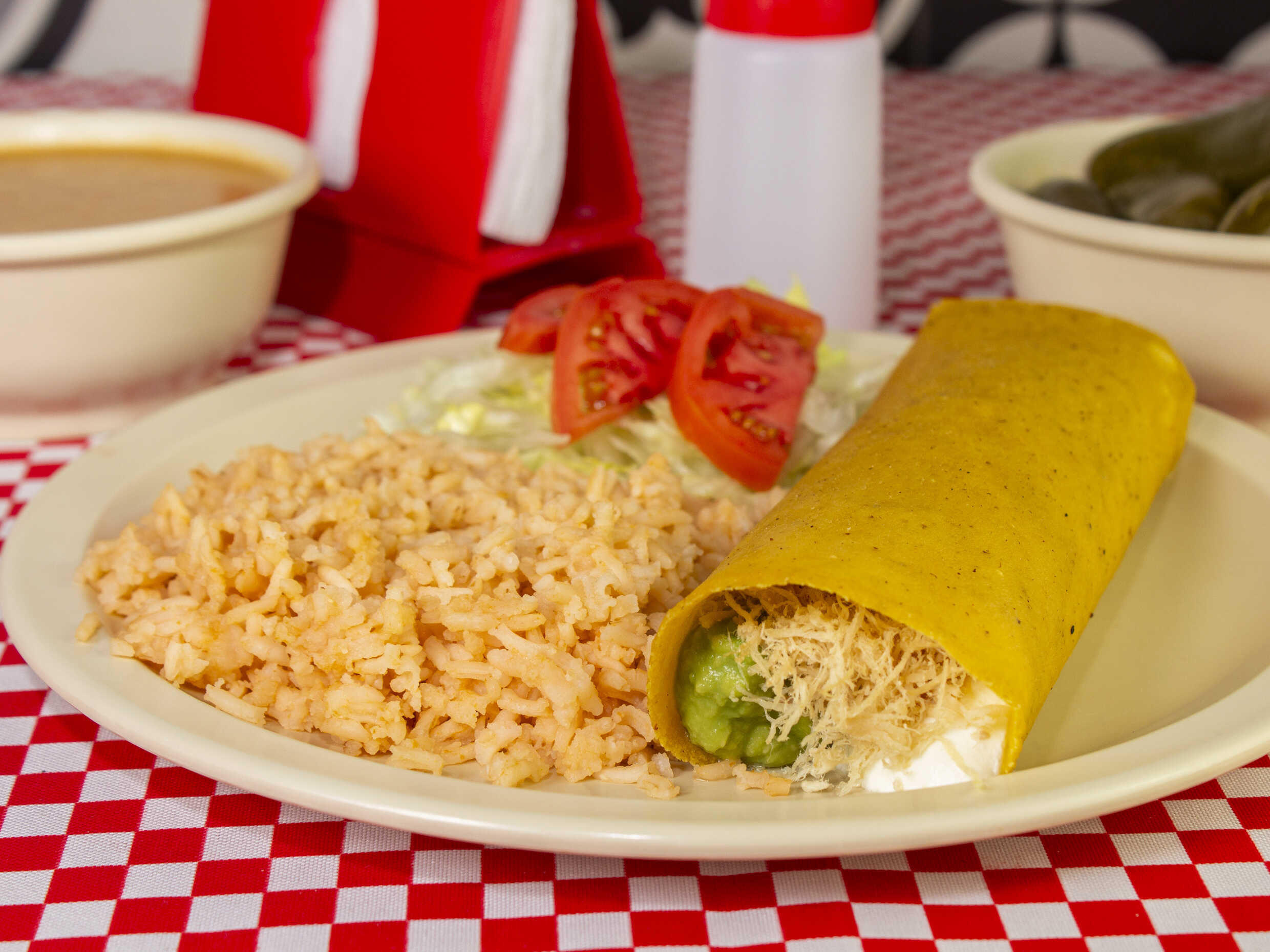 Tortilla de nixtamal con pechuga de pollo, guacamole y crema, acompañada de arroz, ensalada y chiles en escabeche.