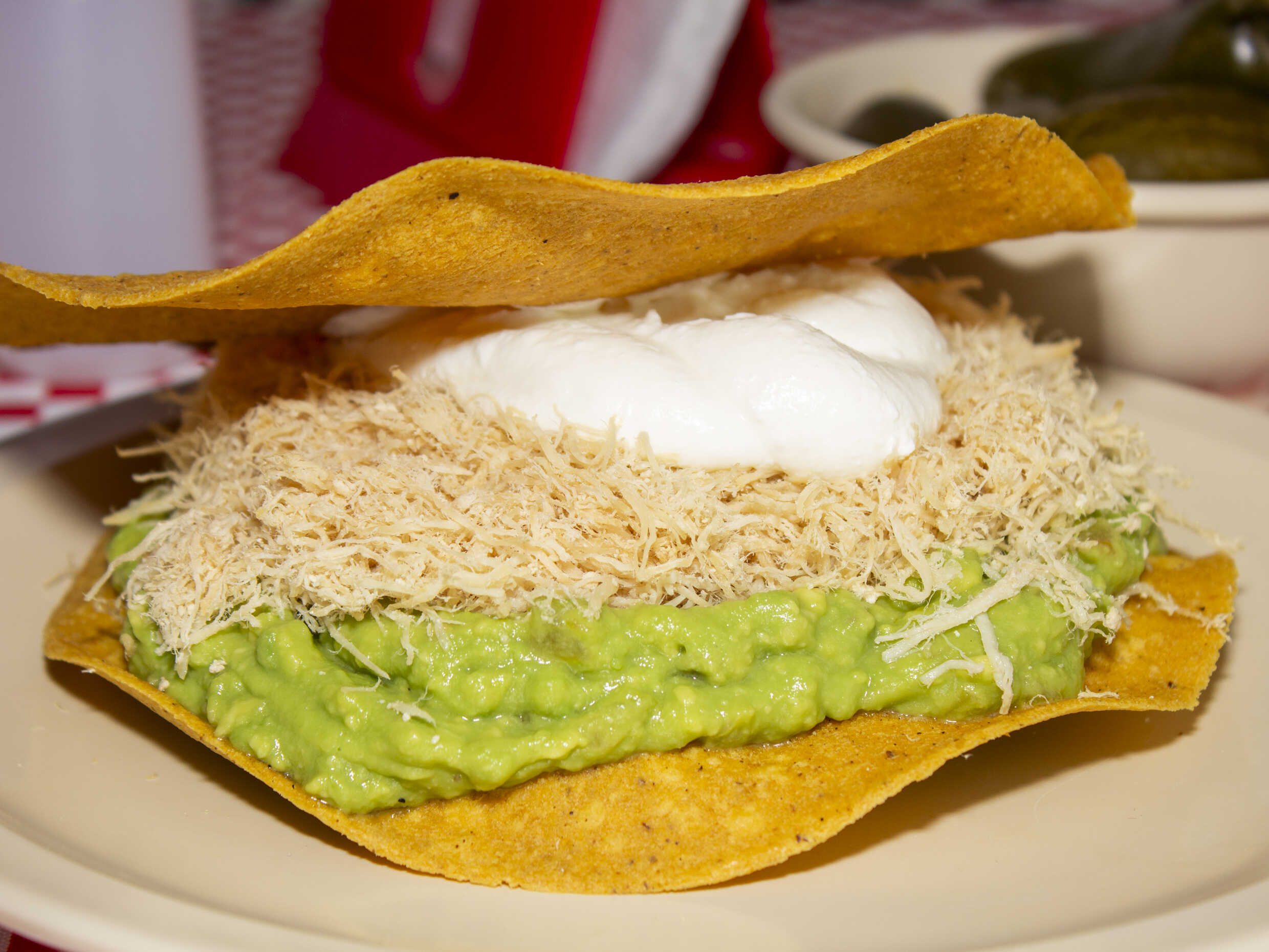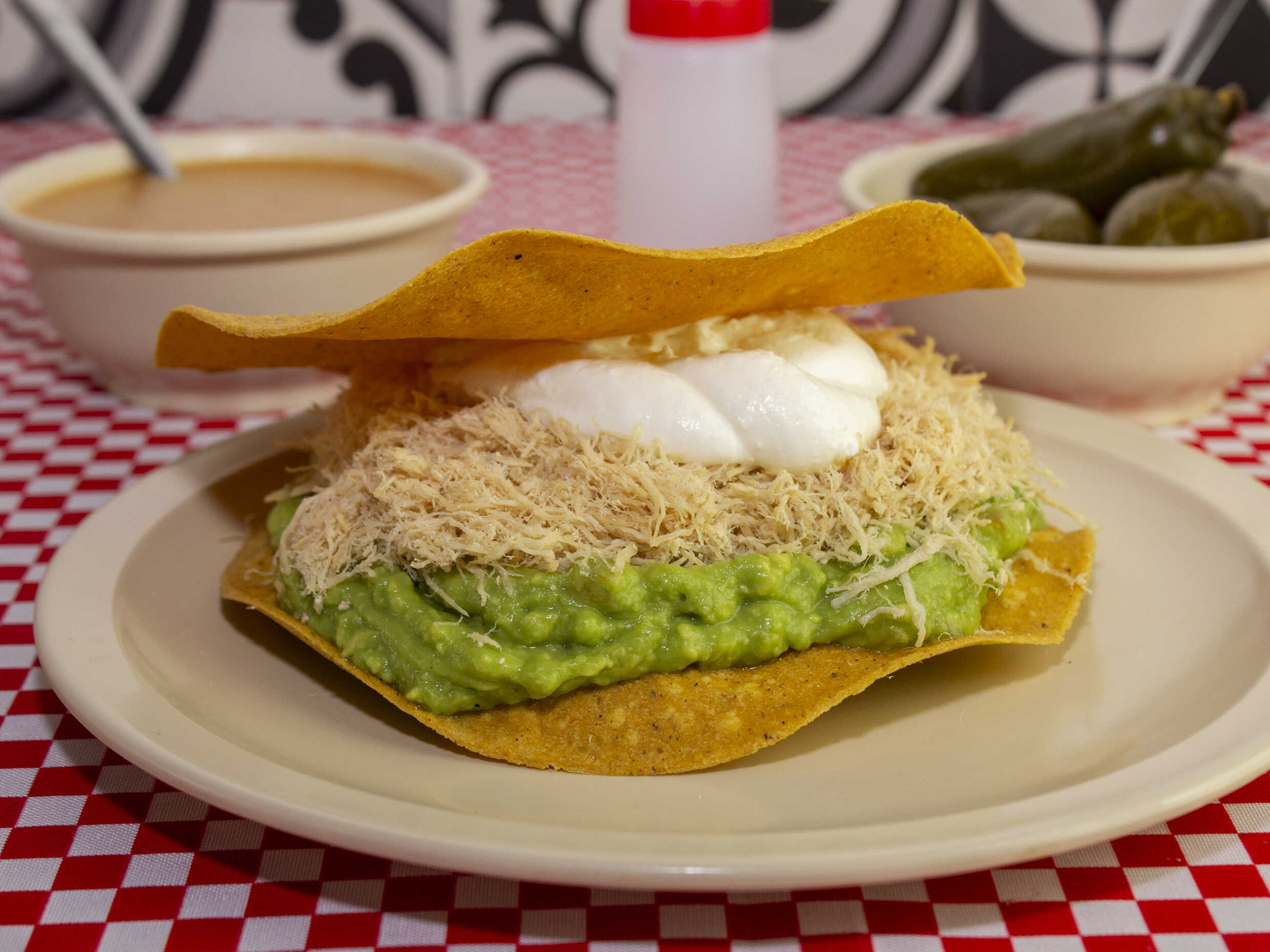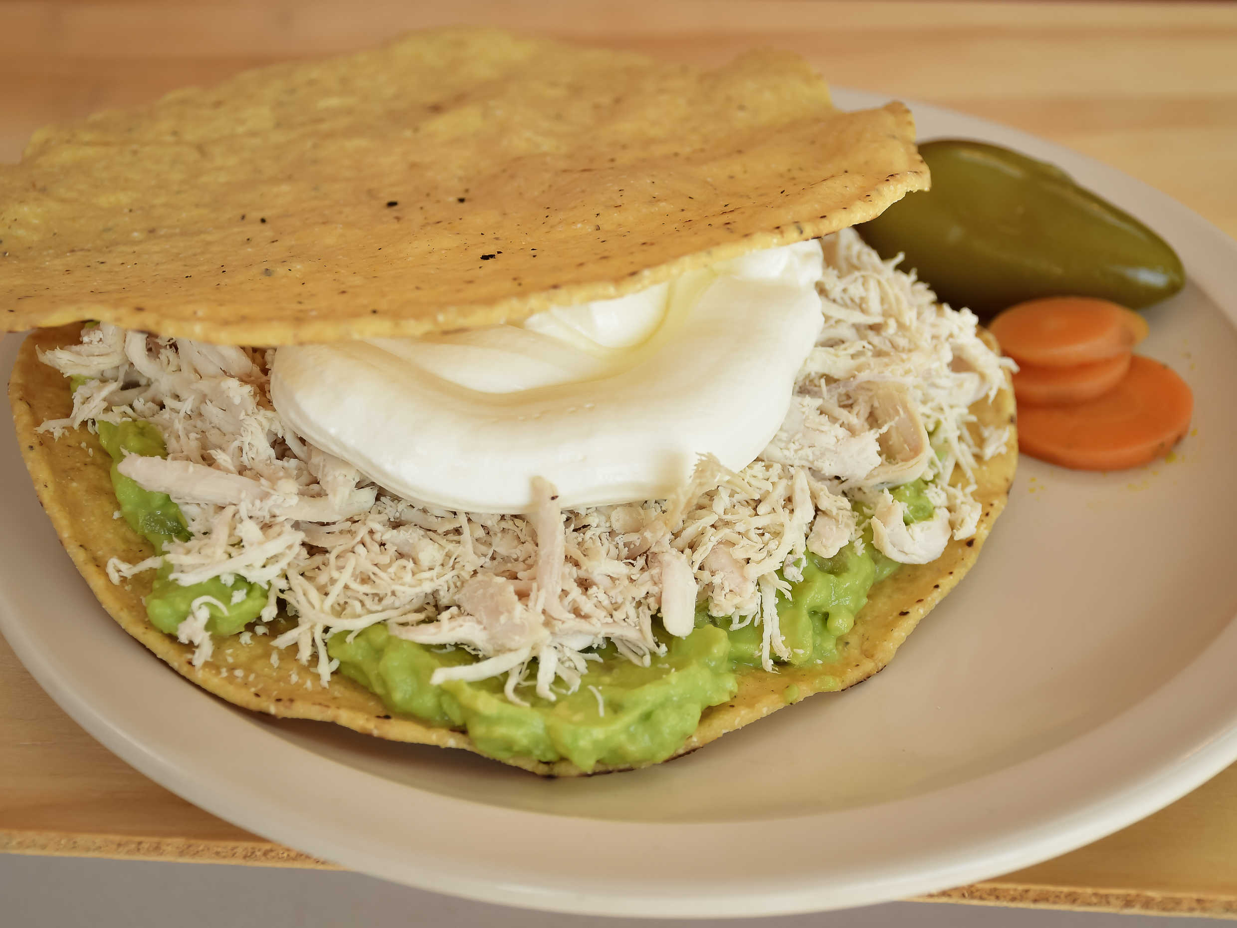 Tostada con guacamole, pechuga de pollo y crema, acompañada de salsa y chiles en escabeche.
