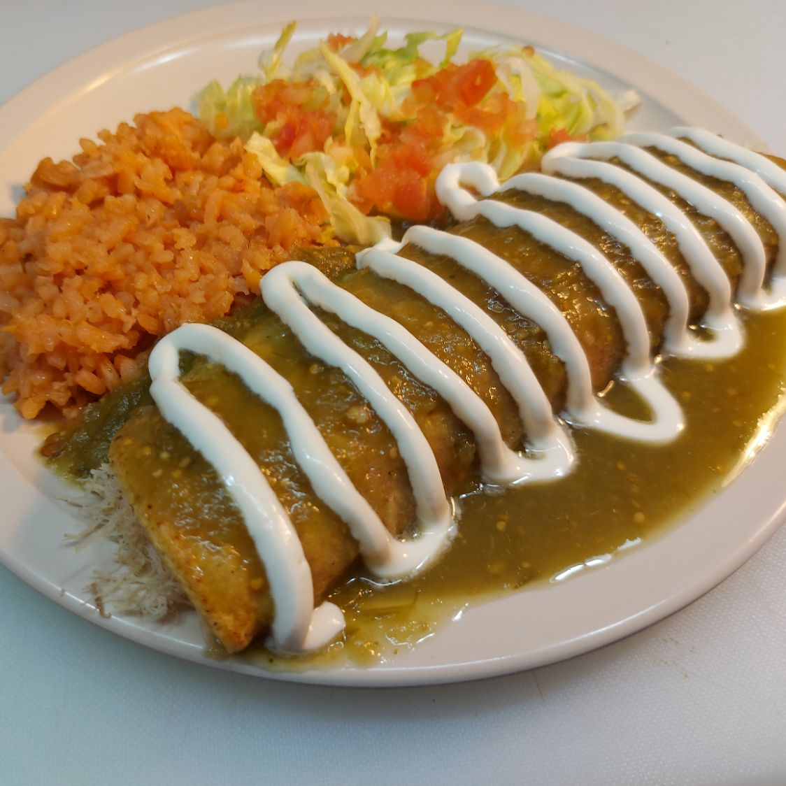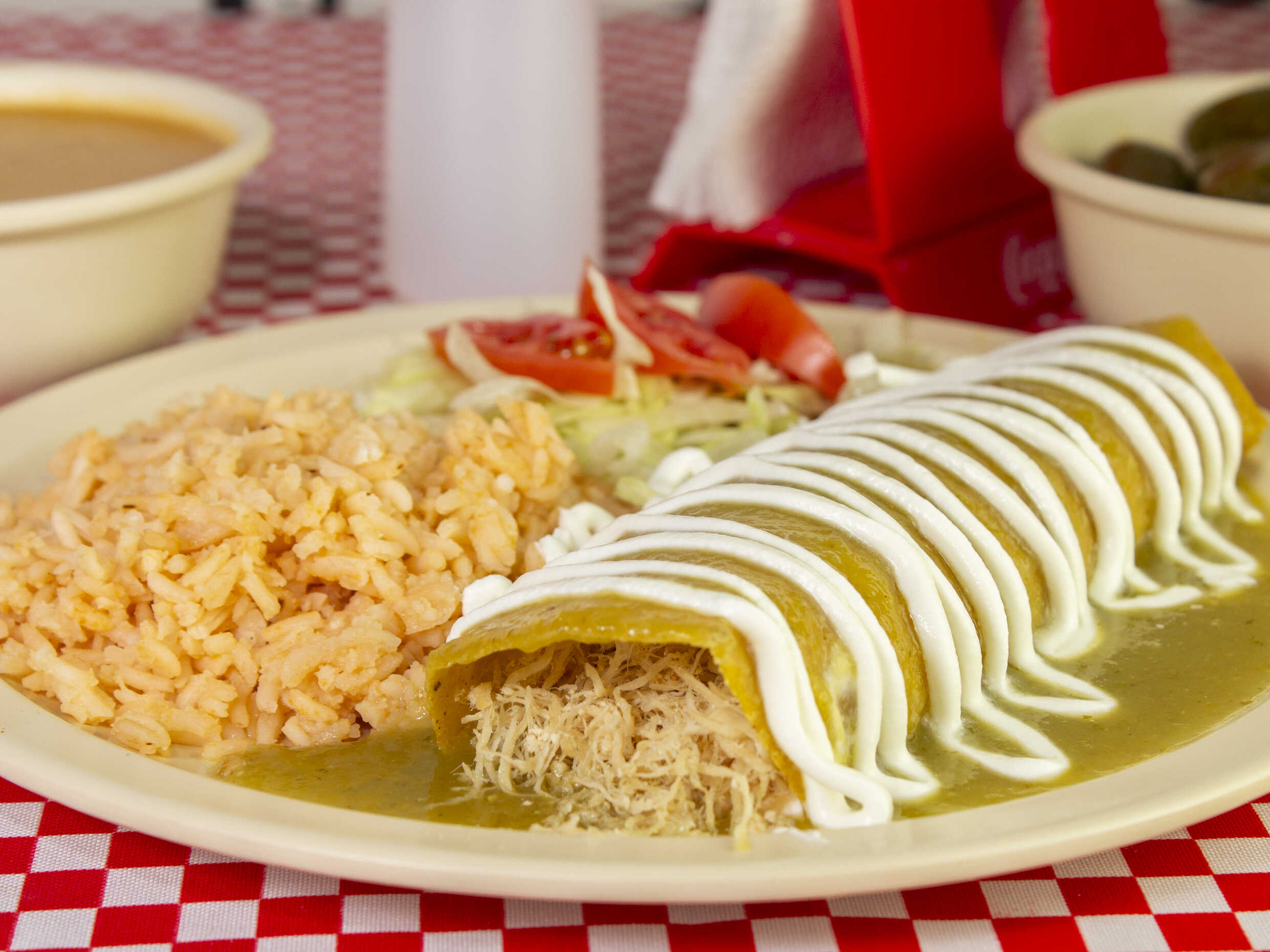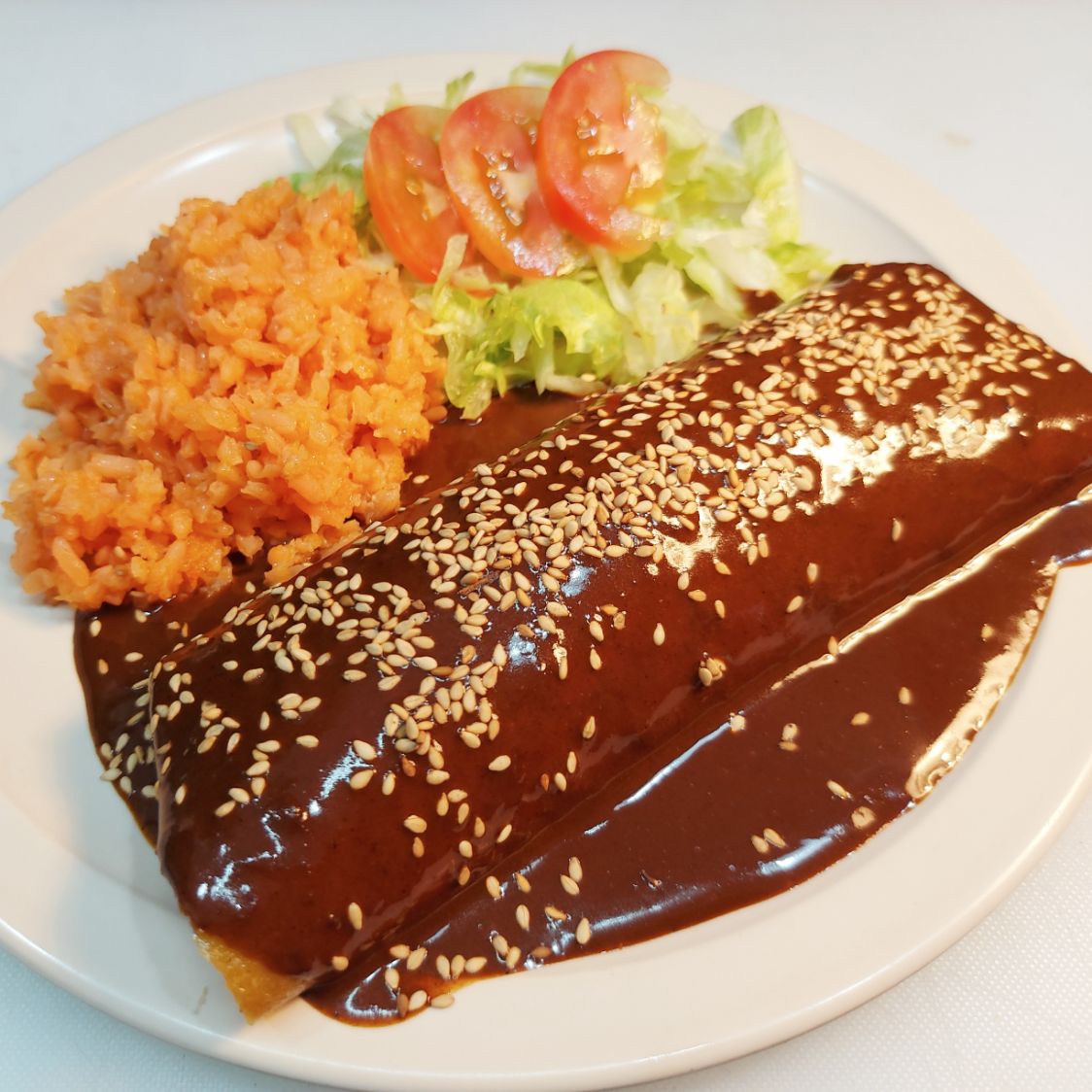 Tortilla de nixtamal con pechuga de pollo, crema, bañada en mole y ajonjoli, acompañada de arroz, ensalada y chiles en escabeche.