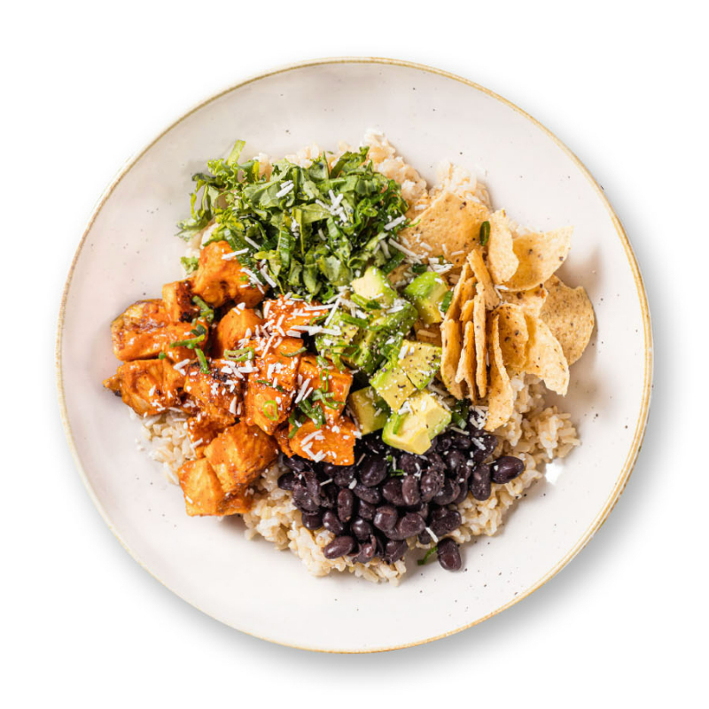 Brown rice y quinoa, pollo en salsa especial spicy, frijolnegro,queso cotija, aguacate, kale, cebollin, chips con Smoky Poblano Ranch y aderezo Mayo Aguacate-cilantro.