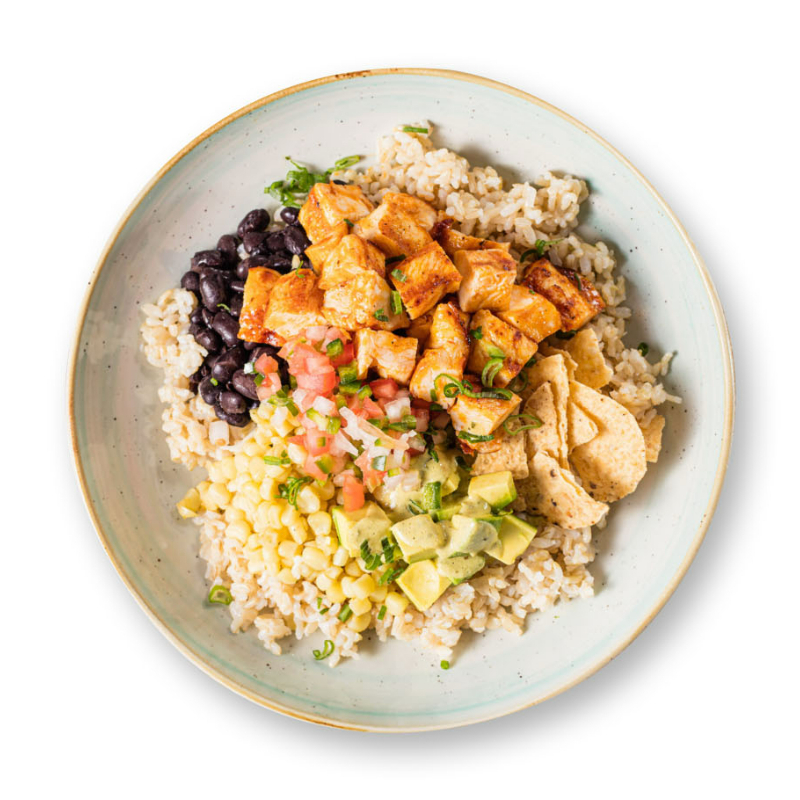 Brown rice y quinoa, pollo lousiana, esquite mix, frijol negro, pico de gallo, aguacate, queso asadero, chips y cebollin con aderezo Smoky Poblano Ranch.