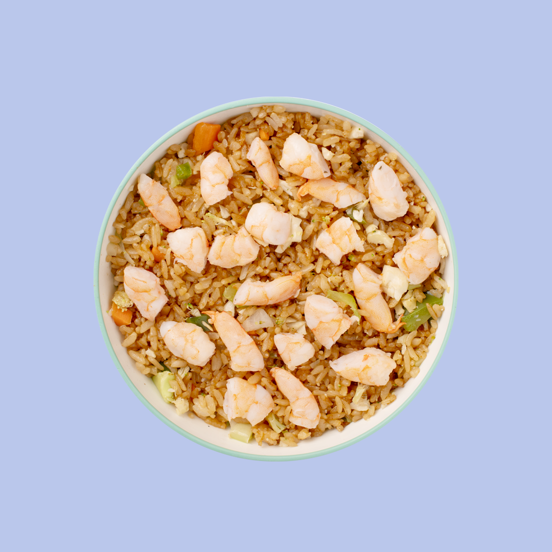 Arroz frito con mix de vegetales, un toque de soya y camarones