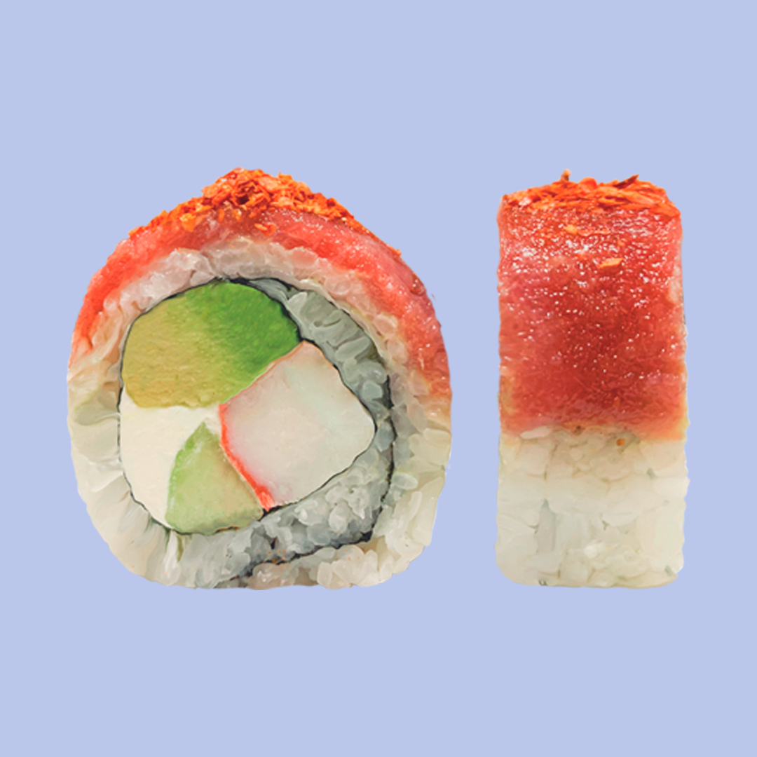 Por dentro: surimi, queso crema, pepino y aguacate. por fuera: atún salsa de anguila y un toque de chile de árbol