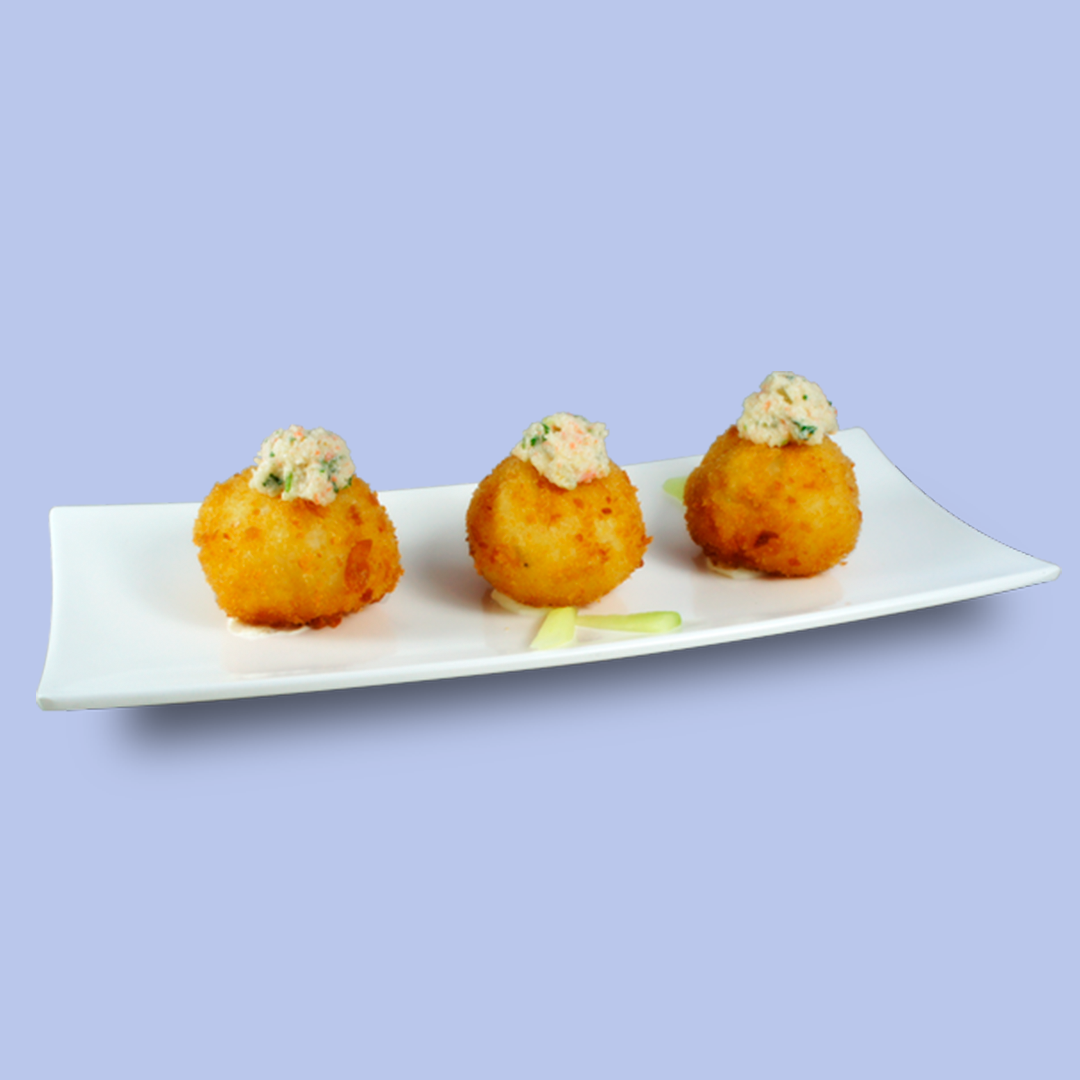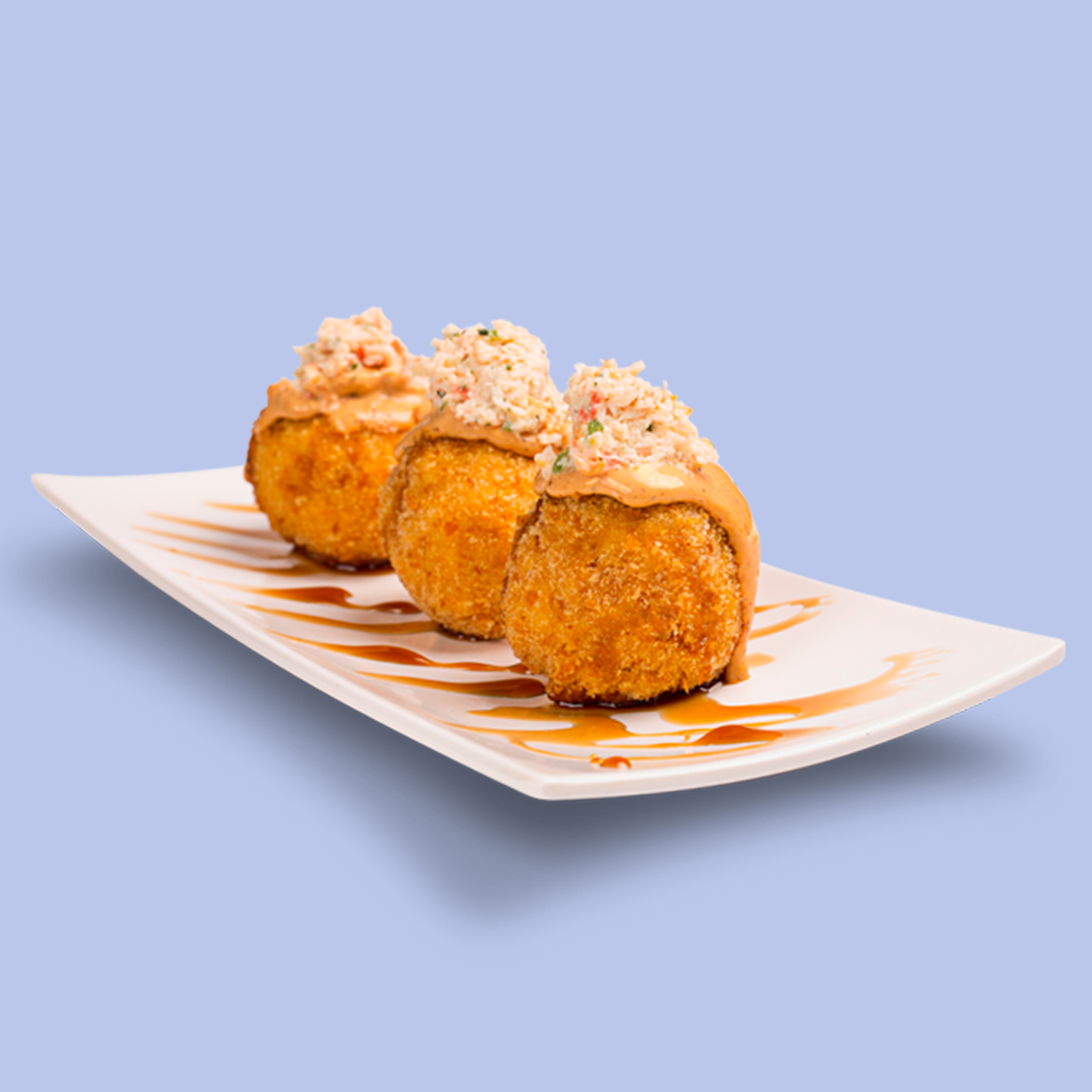 Bolitas de arroz, rellenas de queso crema, camarón y aguacate, empanizadas, con tampico encima, salsa de anguila, salsa chipotle y así