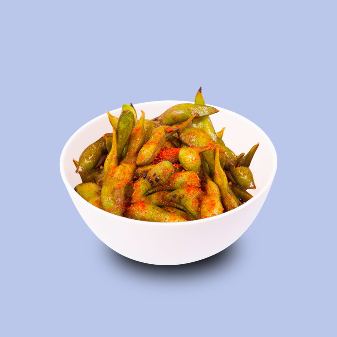 Edamames en su vaina, salteados en mantequilla y ajo, acompañados de salsa de soya, con o sin picante (chile quebrado)