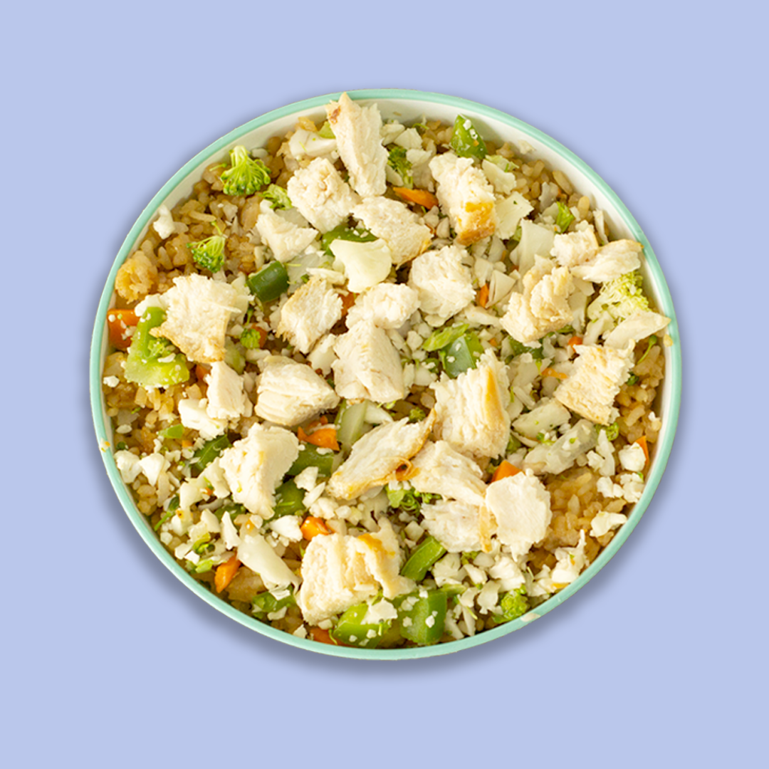 Arroz frito con mix de vegetales, un toque de soya y pollo